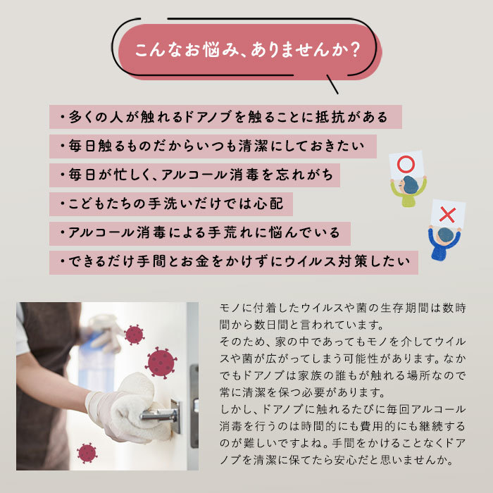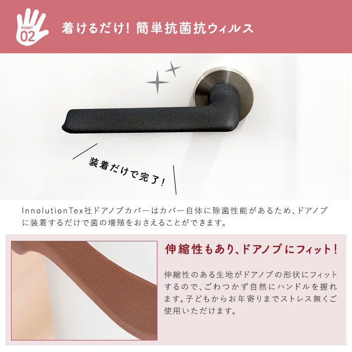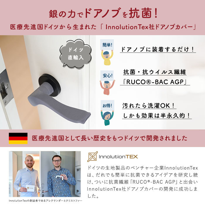 ドアノブカバー,ハンドルカバー,ドアノブ,抗菌,抗ウイルス,除菌,防臭,洗濯できる,効果持続,ドイツ直輸入,ウイルス感染対策,風邪対策,カゼ対策,アルコール消毒,アルコール除菌,お掃除,時短,家事,サステナブル,サスティナブル,リビング,トイレ,子供部屋,医療施設,病院,クリニック,オフィス,会社,会議室,学校,公共施設,図書館,ホテル,レストラン,インテリア,おしゃれ,かわいい,速乾生地,除菌習慣,除菌ストレス,ストレスフリー,簡単装着,除菌スプレー,インフルエンザ,アデノウイルス,コロナウイルス,プール熱,感染症,家庭内感染,対策,育児,手洗い,感染予防,ミニマリスト,清掃,ズボラ主婦,洗濯機,掃除道具,簡単,レバーハンドル,静電気,べたつき,手汗,不快感軽減,傷防止,衛生機能,複数セット,抗菌加工,抗ウイルス加工,抗菌タイプ,握りやすい,洗い替え,調節可能,調整可能,賃貸,賃貸インテリア,自宅,経年劣化,リメイク,diy