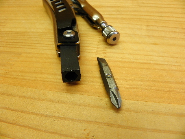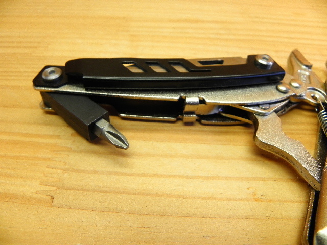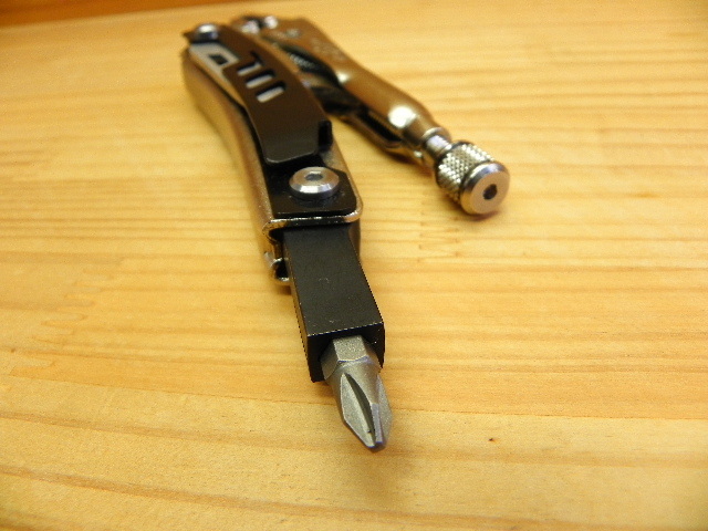 ◎ハンドル部に折り畳みナイフが組み込まれ、ビット式+・-ドライバーが内臓してます。