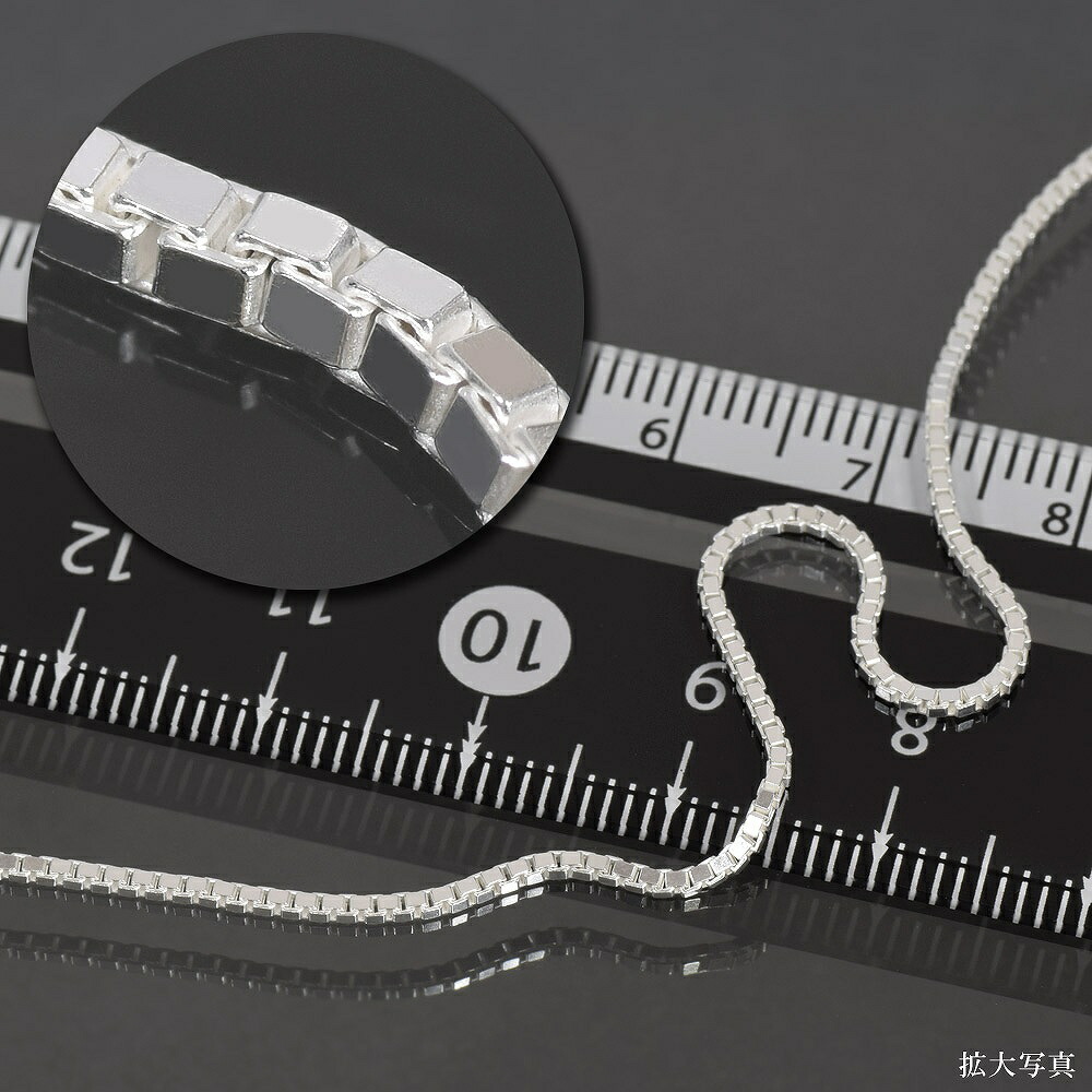 ベネチアンチェーンは正方形のコマが連なったデザインの定番チェーン。キューブ状のパーツが密に連なったボリューム感のあるデザインが特徴で、丈夫で切れにくいチェーンのひとつです。また、構造上絡まりにくく、万が一絡まった場合でも解きやすいチェーンです。ベネチアンという名前は、イタリアの都市ベネチアの家々のボックス型の窓の形に由来していると言われていますが、リンクスチェーン、ボックスチェーンといった名称で呼ばれる事もあります。 |