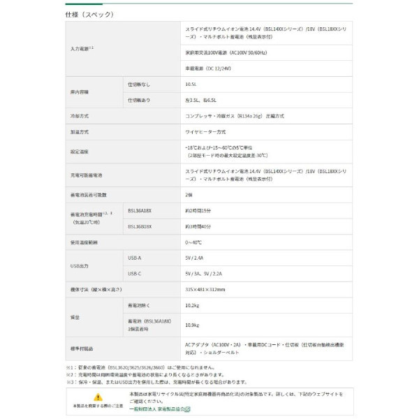 標準付属品 ACアダプタ(AC100V・2A)・車載用DCコード・仕切板(仕切板自動検出機能対応)・ショルダーベルト