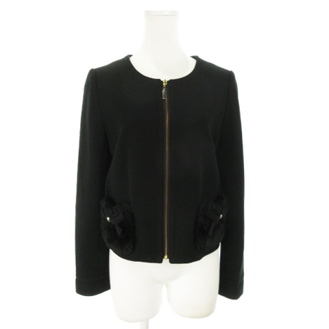 ユニバーバル ミューズ UNIVERVAL MUSE ジャケット ノーカラー ジップアップ ウール混 リボン ファー フェミニン 黒 ブラック レディース
