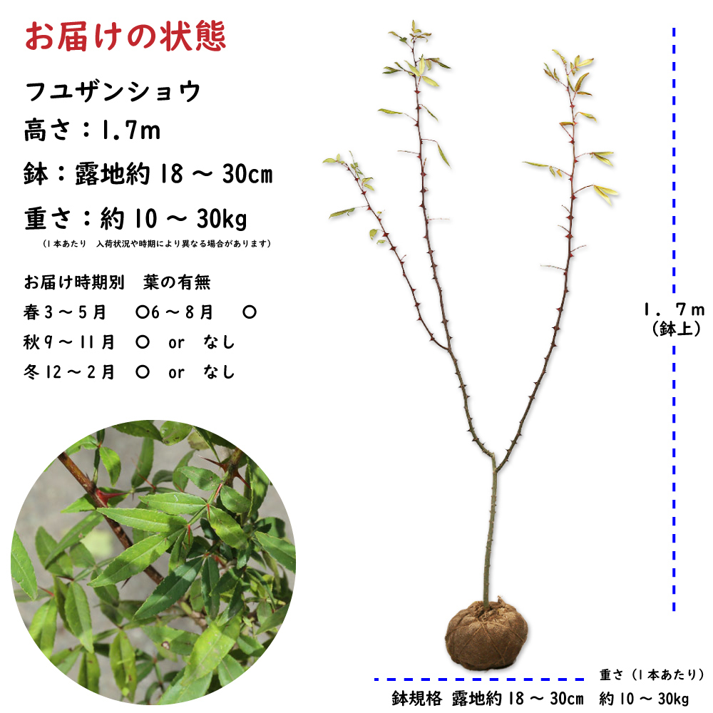 【商品情報】フユザンショウは3mになる常緑低木です。日本(兵庫県)が原産です。葉は奇数羽状複葉で、小葉は長楕円形で縁は鋸状です。花は淡黄色で小さい花を房状に咲かせます。幹は1cmほどの鋭いトゲがあります。若葉は「木の芽」として和食料理に使われます。縄文時代から香辛料、薬用として利用されてきました。花は料理の彩りや佃煮などに利用されます。果皮にはサンショオールという毒性の成分があり、これを用いる漁法もあります。木材はすりこ木に用いられます。