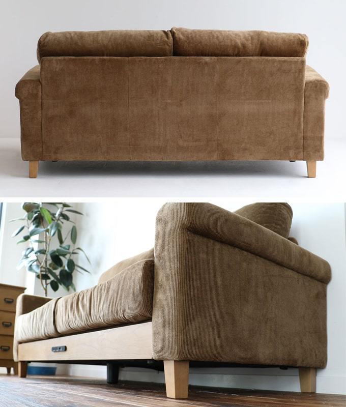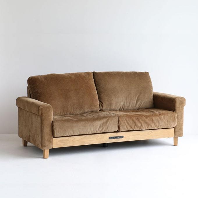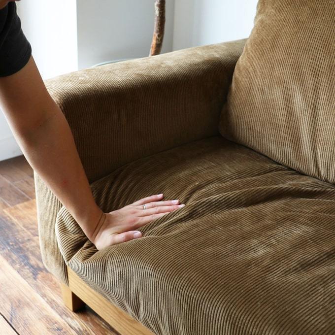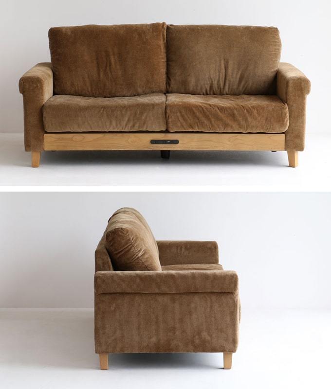 コーデュロイ生地の張地がカジュアルでお洒落な2シーターソファ。