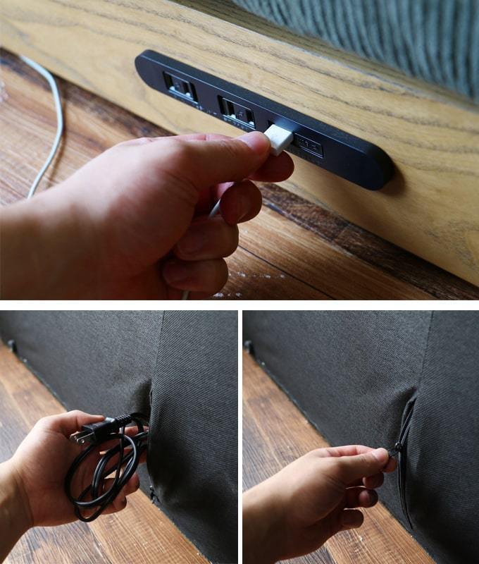 ソファ前面の下部にコンセント2口とUSBタップが付いていて、スマートフォンや携帯電話などの充電ができます。