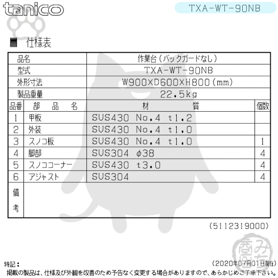 TXA-WT-90NB タニコー タニコー ステンレス 作業台 幅900奥600高800BGなし