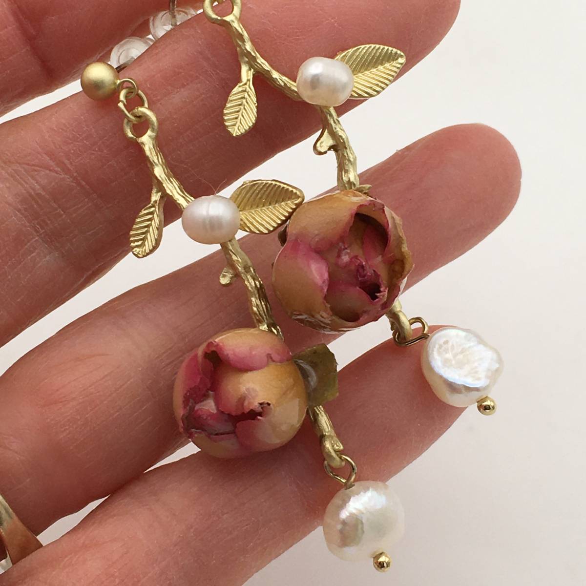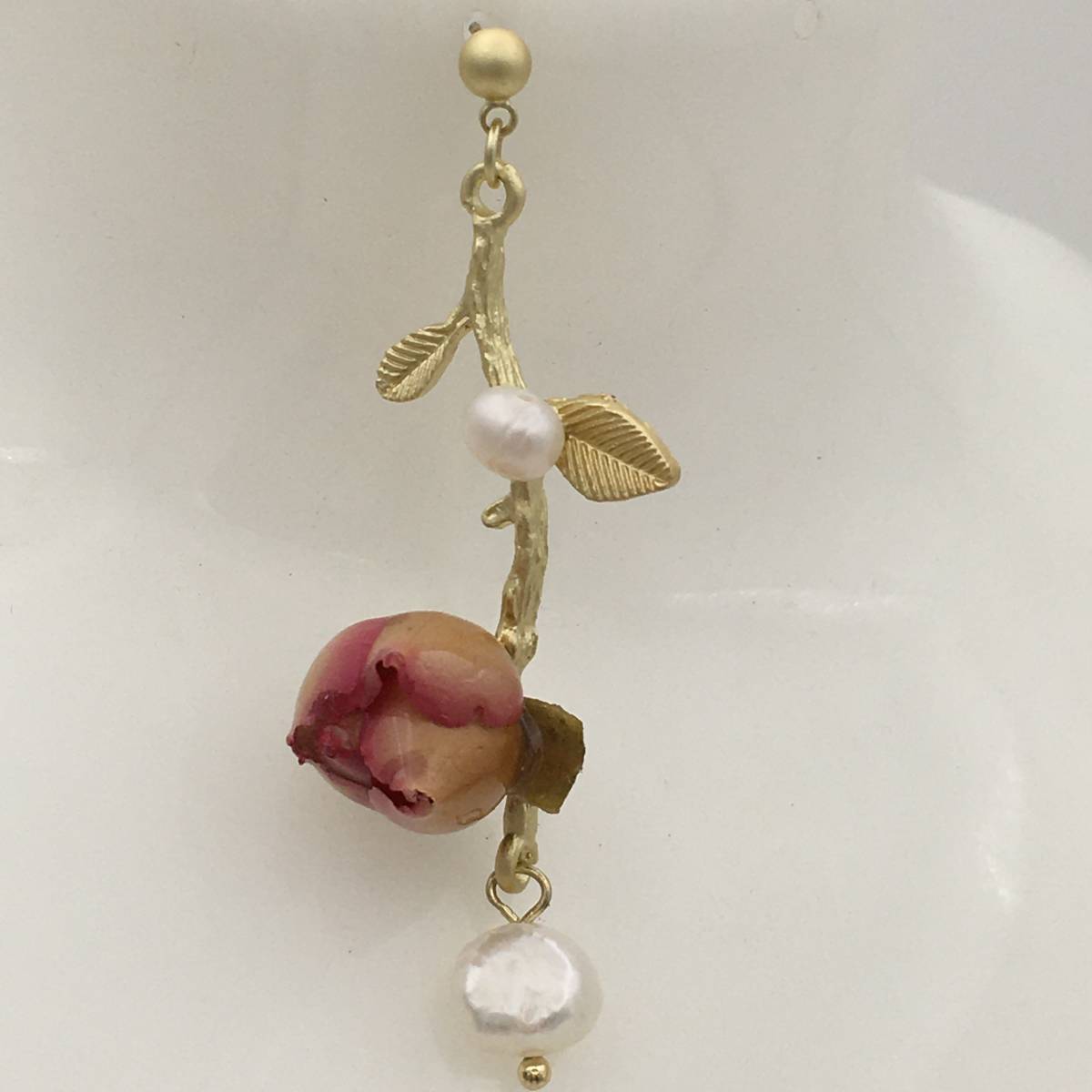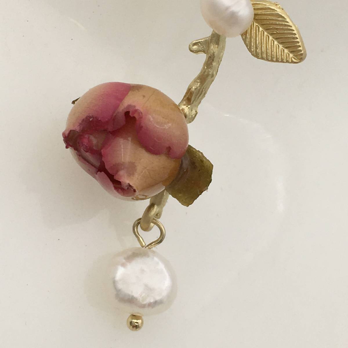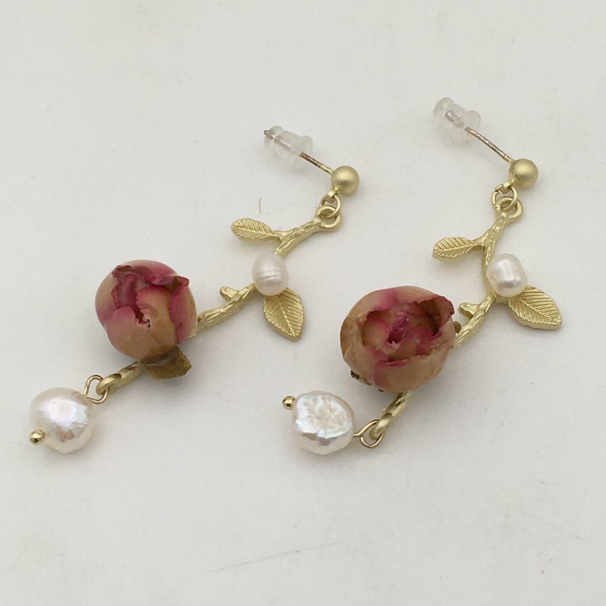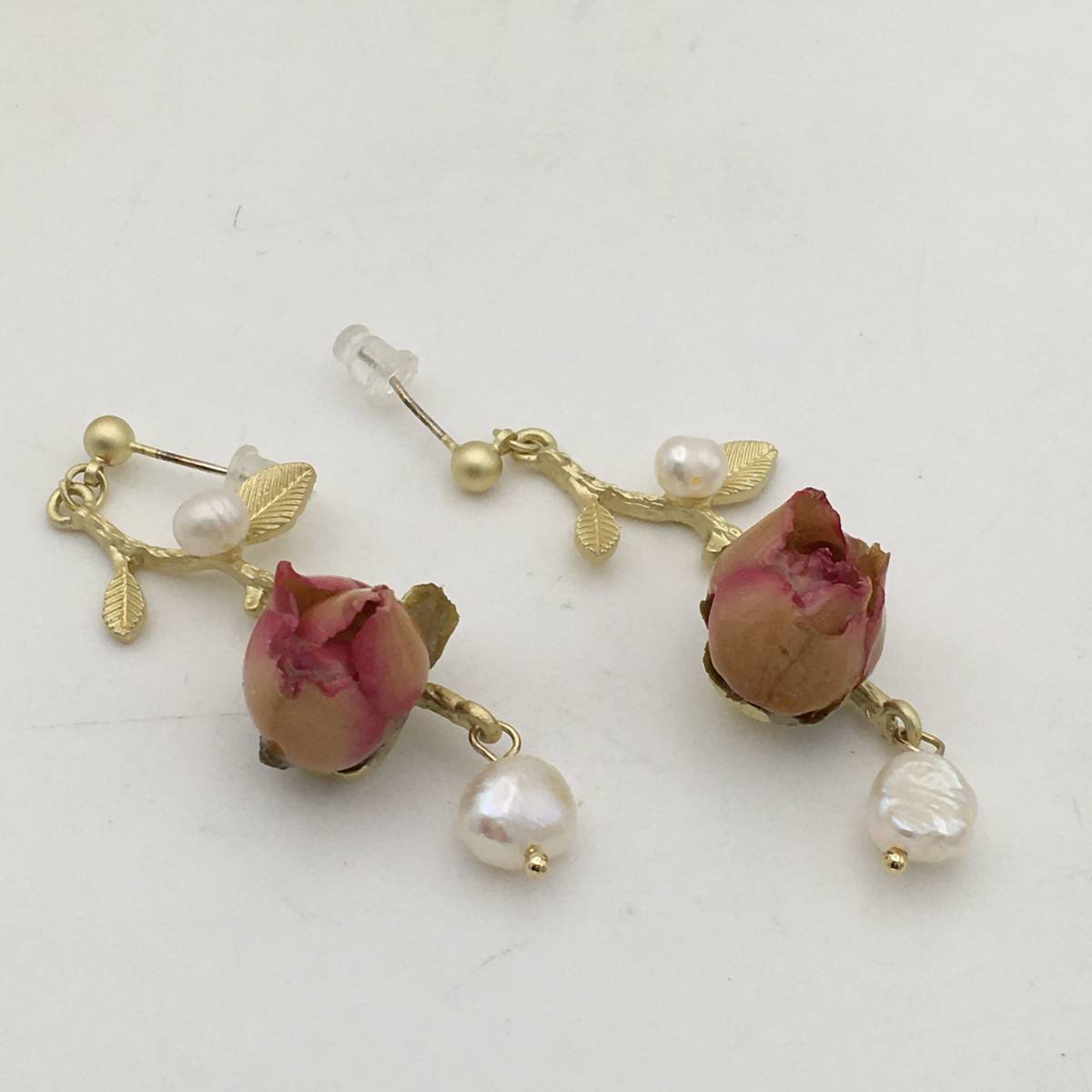 <新品>ピアス ホワイト 淡水パール ローズ バラ ピンク アンティーク調 ロング 長い ダングル スタッド 結婚式 プレゼント パーティー
