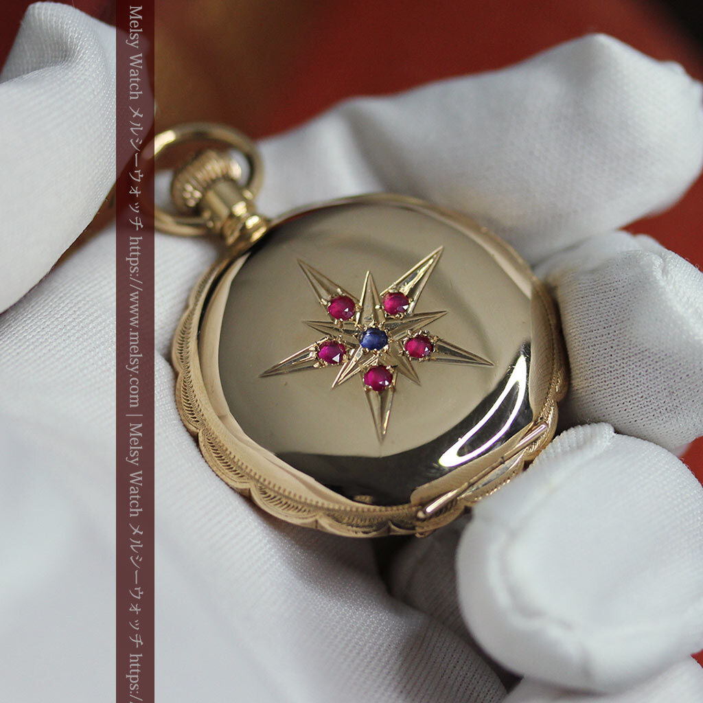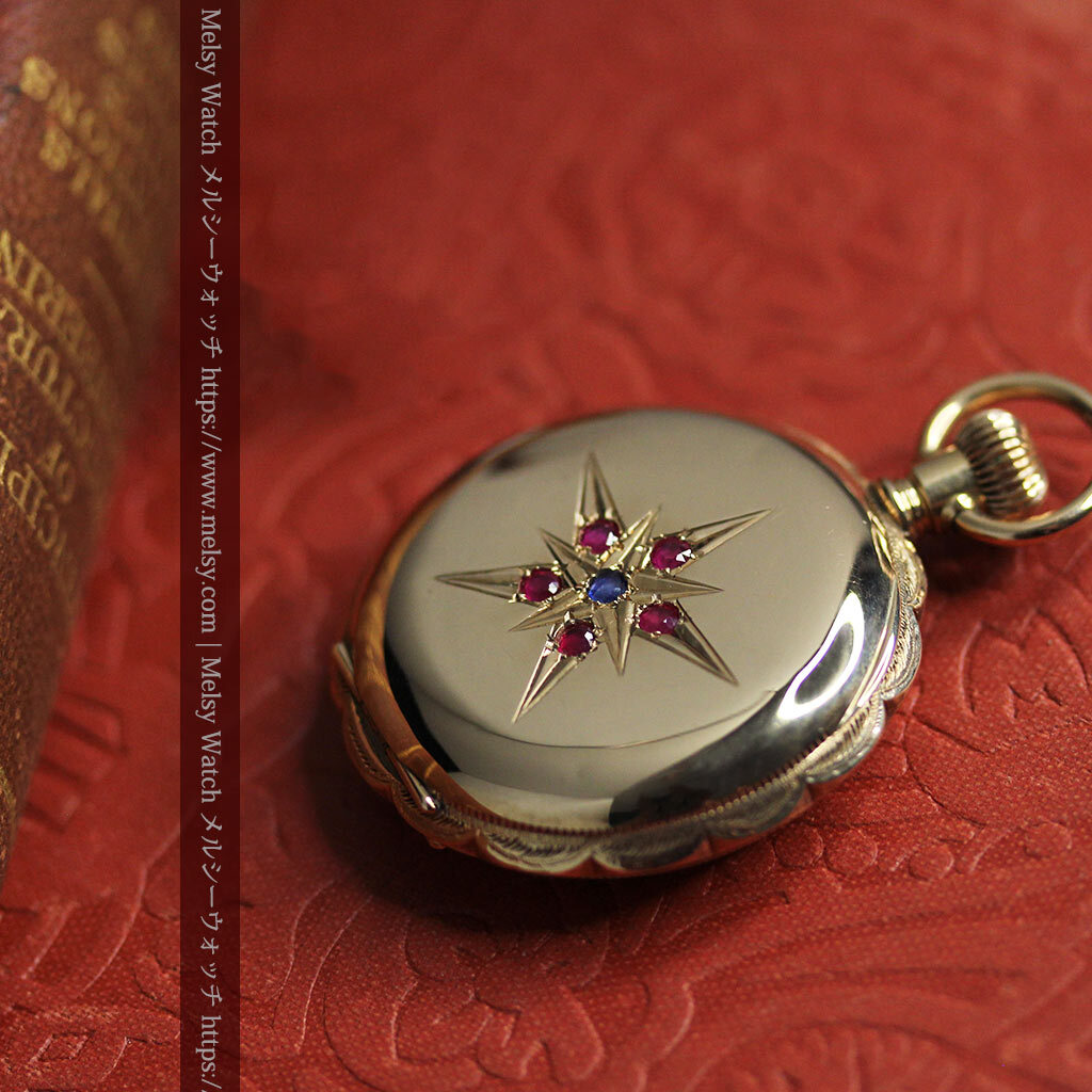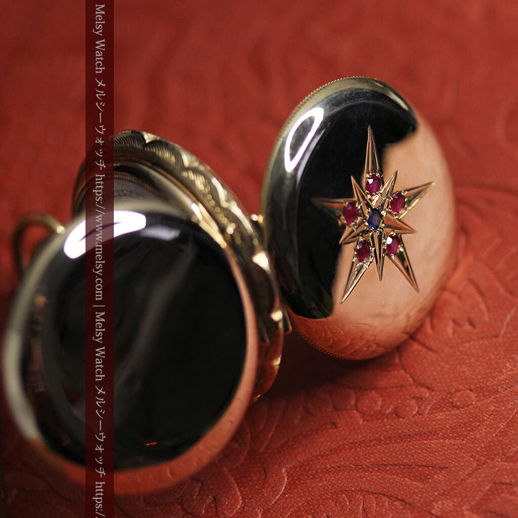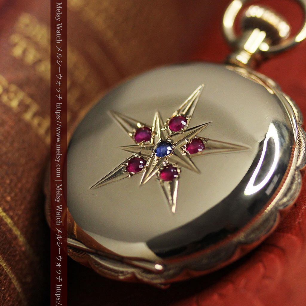 貴方にとっての特別とは、どのようなものですか? 誰もが認める著名なブランド物ですか? もし「これが好きだから」と感じられるものが、貴方にとっての特別であるなら、こんな懐中時計を気に入って頂けるかもしれません。 確かに繊細でびっしりと刻まれた装飾とは違って、一見すると素朴な印象を受けられるかもしれません。 しかしながら、こちらで扱う懐中時計や他でご覧頂く時計も合わせて、この懐中時計のような姿となると、なかなかご覧頂く機会が無いのではないかと思います。 それもそのはずで、大きなサイズとなると素朴・シンプルなものが多くなりますが、小さな蓋付きのハンターケースと呼ばれるものは、比較的全面に装飾が施されているものが多いもの。 確かにそれはそれで見どころですが、色々と見て回ると、はっと心を掴まれるような時計を探すのが難しくなるかもしれません。 こちらの懐中時計は、そんな特別さを求める方にお勧めしたい1点。 交わる星と色違いの宝石が見せる この懐中時計の大きな特徴は、写真でもご覧頂ける通り、ケースの表側に装飾された2つの重なる星の彫りと、それぞれの星を彩る5つのルビーとサファイア。 赤い宝石と青い宝石という色の対比も面白く、大きな星の彫りの中に小さな星というデザインもまた魅力的。 全面に装飾を施すのではなく、空白を残しながら星を配置することで、この装飾部分がとても際立って見えるデザインになっています。 ケースの反対側には何も装飾はありませんが、自分の好みの彫りを入れる、またはそのまま鏡面として楽しむのも1つ。 またもう1つの魅力は、蓋を開くとその顔を楽しむことができる、文字盤に施された上品な銀と青の装飾。 美しい形の長針と短針の組み合わせもまた、この時代のこの文字盤にとても良く似合っています。 |