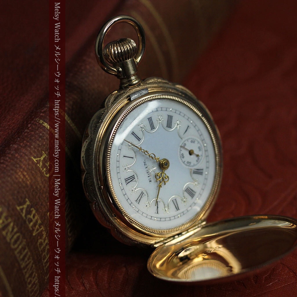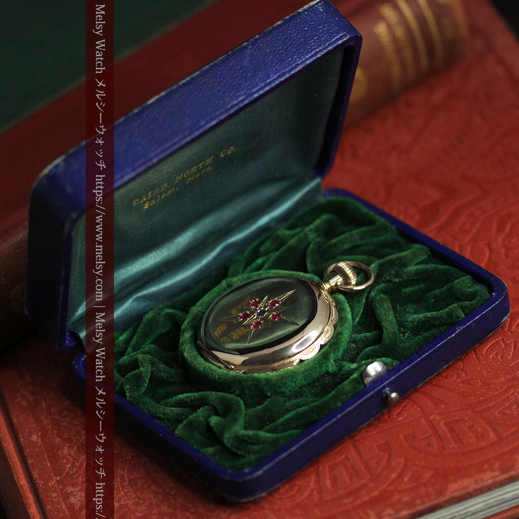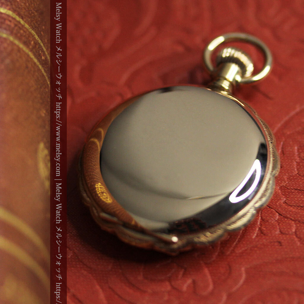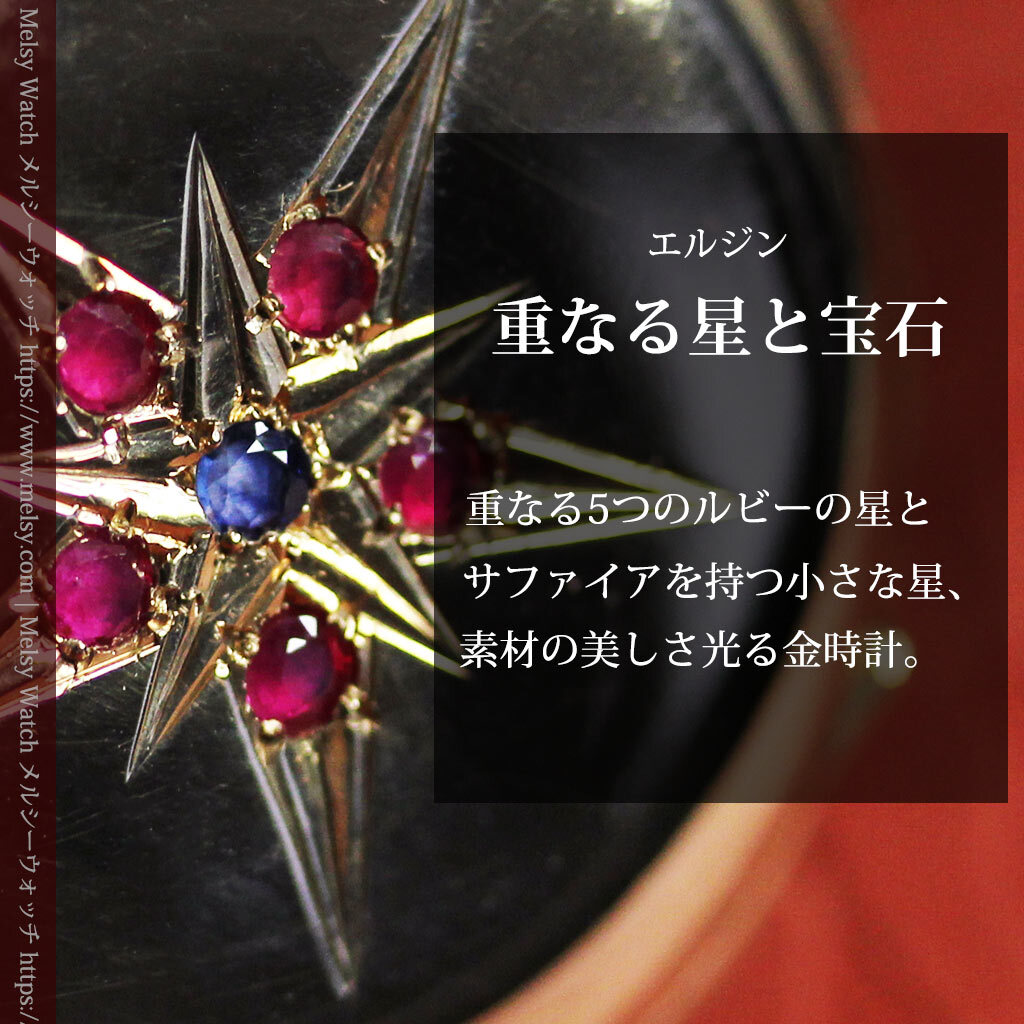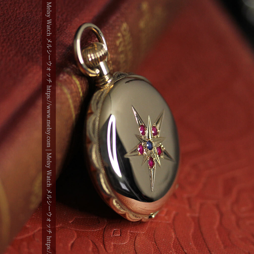 貴方にとっての特別とは、どのようなものですか? 誰もが認める著名なブランド物ですか? もし「これが好きだから」と感じられるものが、貴方にとっての特別であるなら、こんな懐中時計を気に入って頂けるかもしれません。 確かに繊細でびっしりと刻まれた装飾とは違って、一見すると素朴な印象を受けられるかもしれません。 しかしながら、こちらで扱う懐中時計や他でご覧頂く時計も合わせて、この懐中時計のような姿となると、なかなかご覧頂く機会が無いのではないかと思います。 それもそのはずで、大きなサイズとなると素朴・シンプルなものが多くなりますが、小さな蓋付きのハンターケースと呼ばれるものは、比較的全面に装飾が施されているものが多いもの。 確かにそれはそれで見どころですが、色々と見て回ると、はっと心を掴まれるような時計を探すのが難しくなるかもしれません。 こちらの懐中時計は、そんな特別さを求める方にお勧めしたい1点。 交わる星と色違いの宝石が見せる この懐中時計の大きな特徴は、写真でもご覧頂ける通り、ケースの表側に装飾された2つの重なる星の彫りと、それぞれの星を彩る5つのルビーとサファイア。 赤い宝石と青い宝石という色の対比も面白く、大きな星の彫りの中に小さな星というデザインもまた魅力的。 全面に装飾を施すのではなく、空白を残しながら星を配置することで、この装飾部分がとても際立って見えるデザインになっています。 ケースの反対側には何も装飾はありませんが、自分の好みの彫りを入れる、またはそのまま鏡面として楽しむのも1つ。 またもう1つの魅力は、蓋を開くとその顔を楽しむことができる、文字盤に施された上品な銀と青の装飾。 美しい形の長針と短針の組み合わせもまた、この時代のこの文字盤にとても良く似合っています。 |