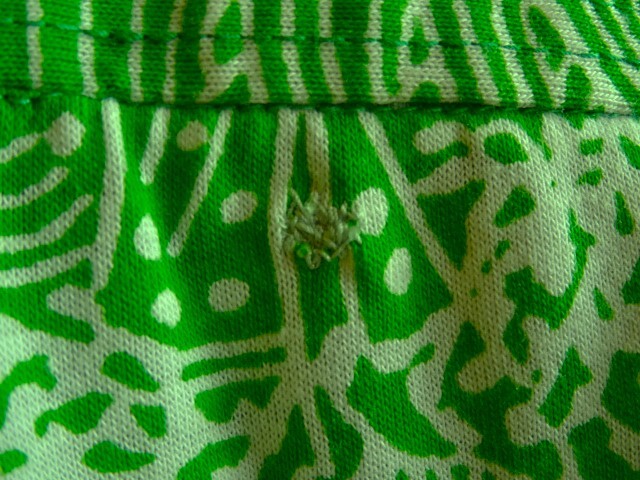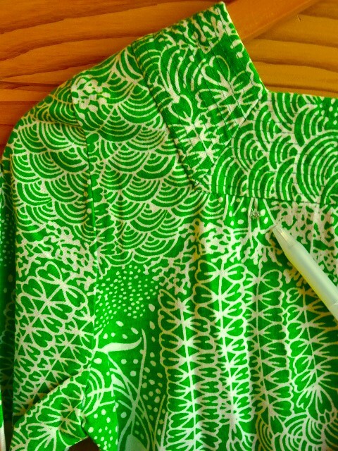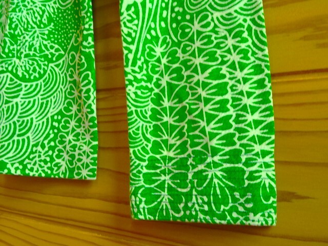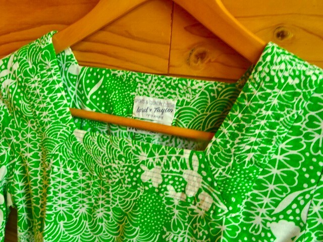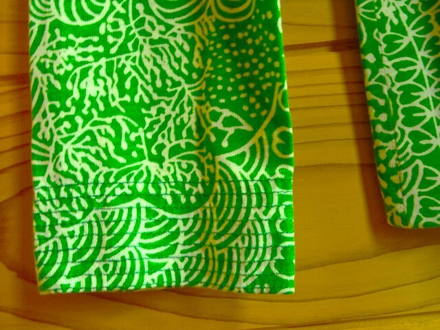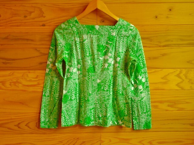 レトロなボタニカル柄、黄緑色と白色のバイカラーがお洒落な一着です。