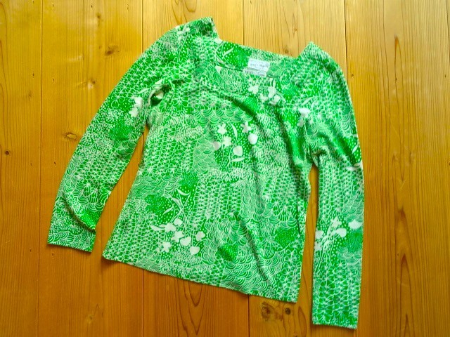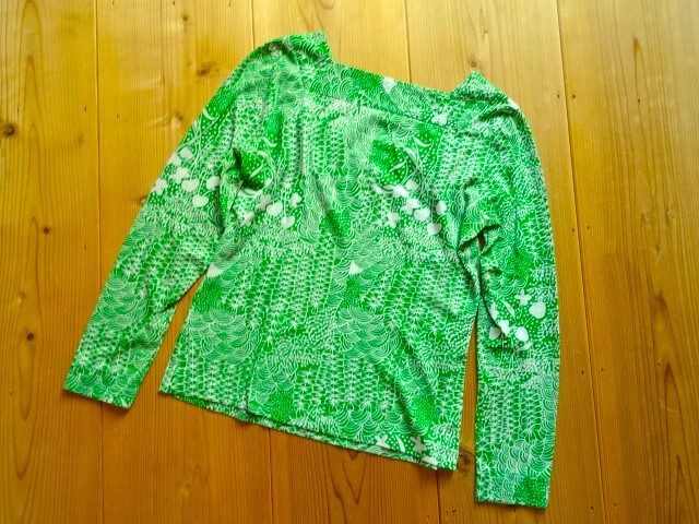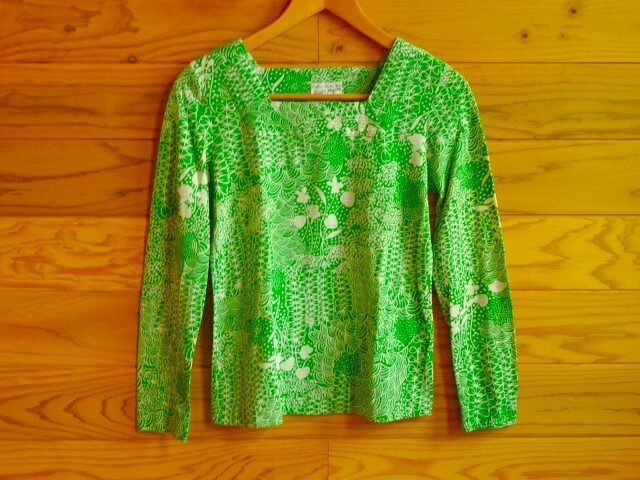 60's USA製 Lord&Taylor ヴィンテージ カットソー 長袖Tシャツ ボタニカル総柄 レトロ ヒッピー 70s 個性派 黄緑白 ML オールド USED 古着