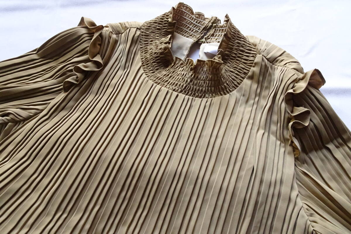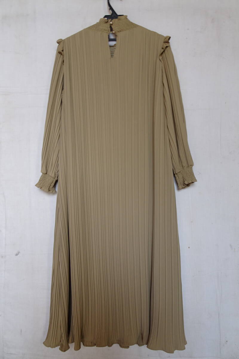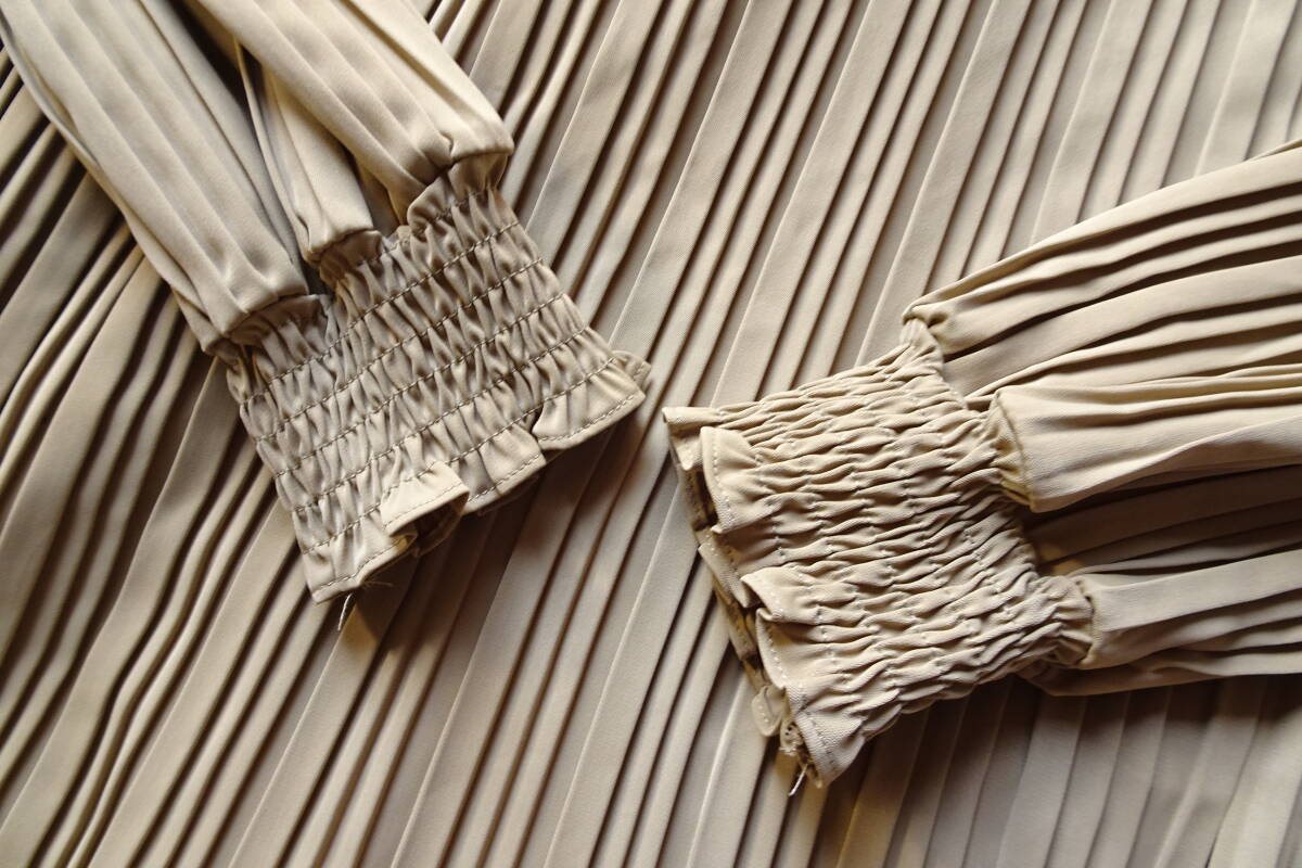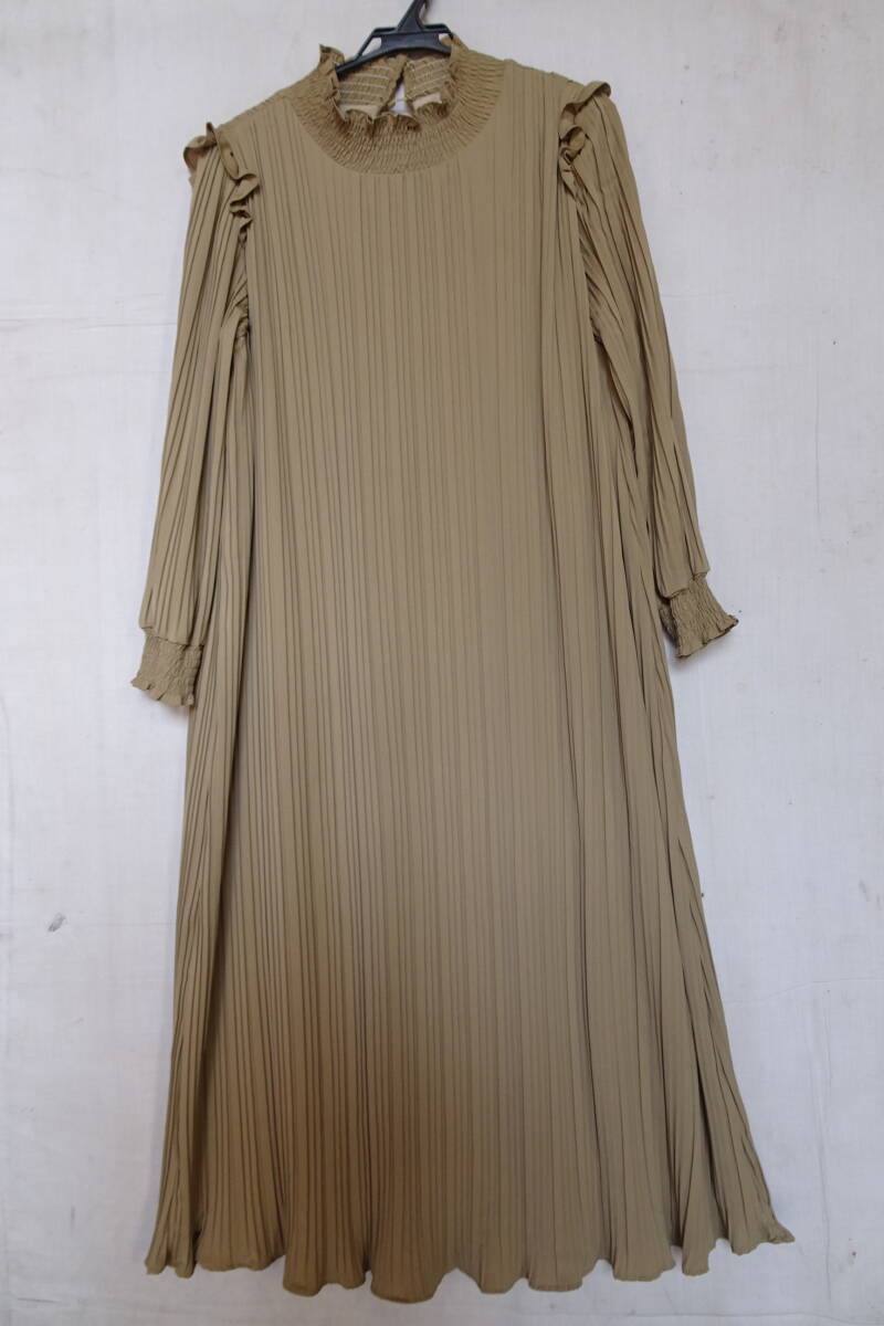 fifth/フィフス/長袖ワンピース/ストレートロング丈/プリーツ生地/首ぐり・袖口シャーリングゴム/肩フリル/ベージュ系カーキ(3/11R)
