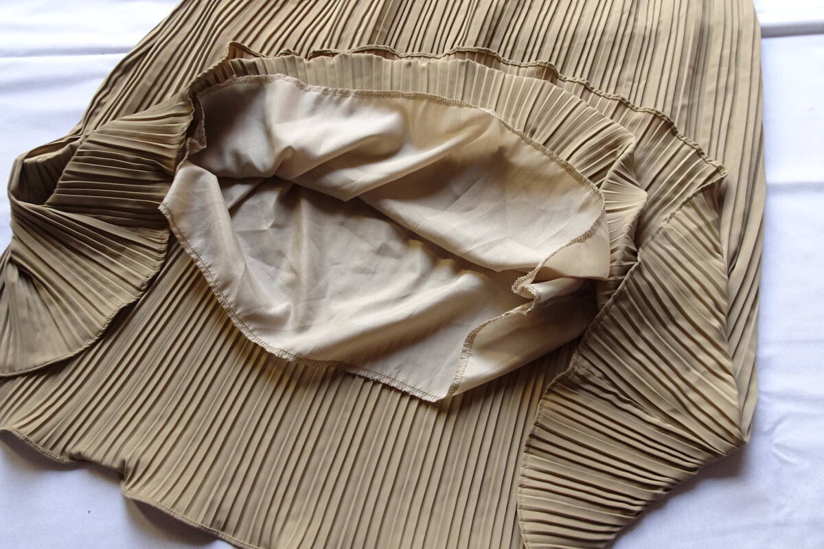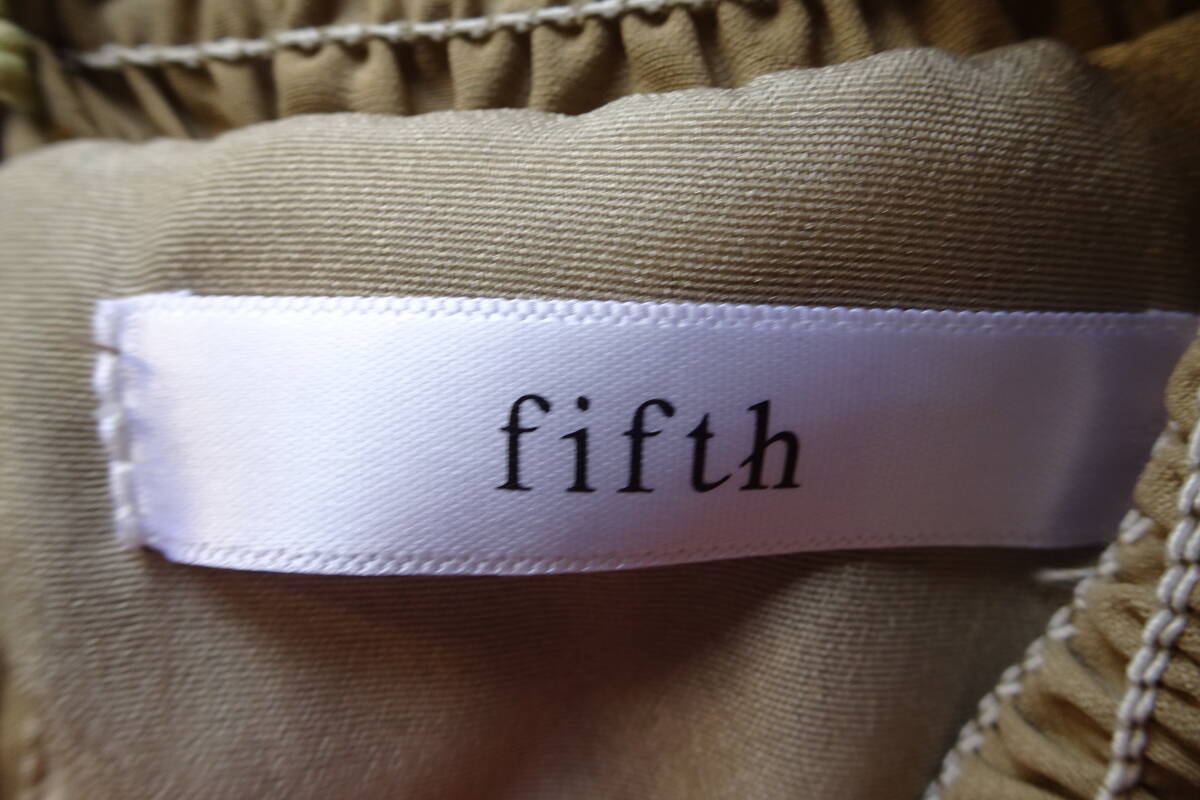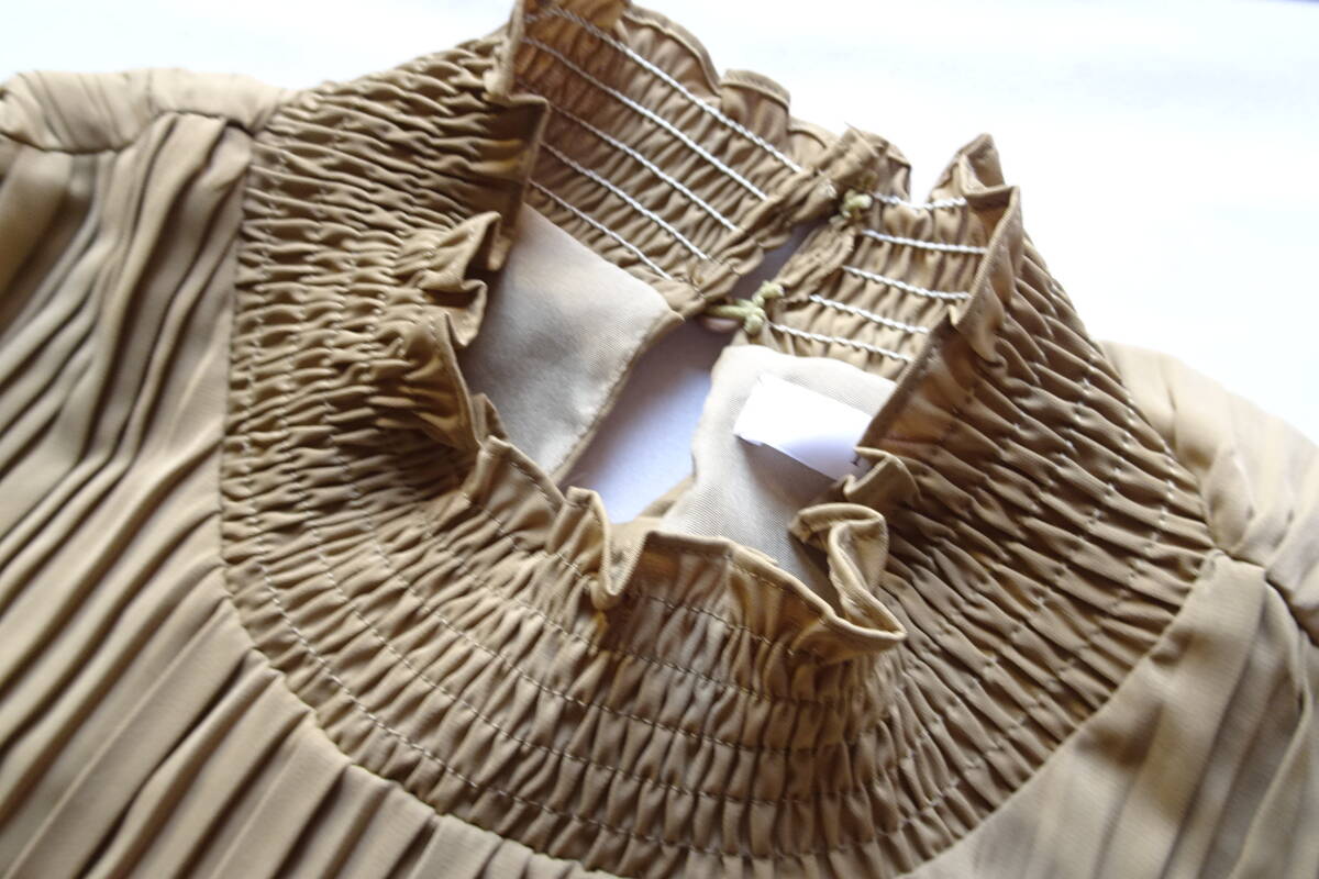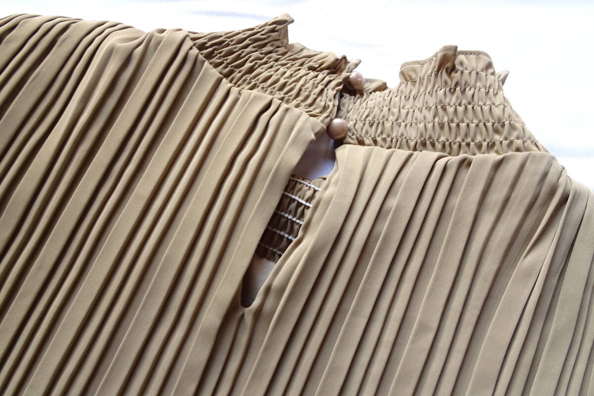 fifth/フィフス/長袖ワンピース/ストレートロング丈/プリーツ生地/首ぐり・袖口シャーリングゴム/肩フリル/ベージュ系カーキ(3/11R)