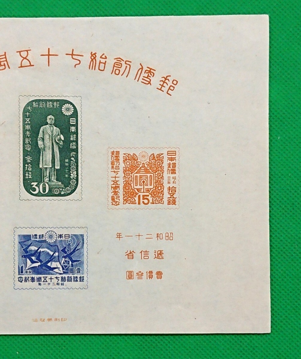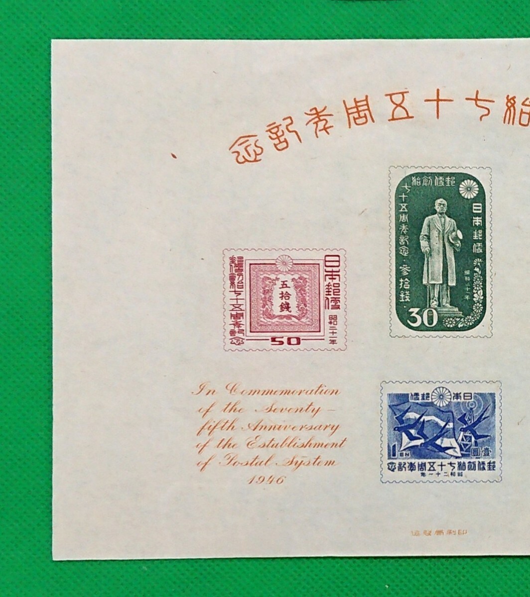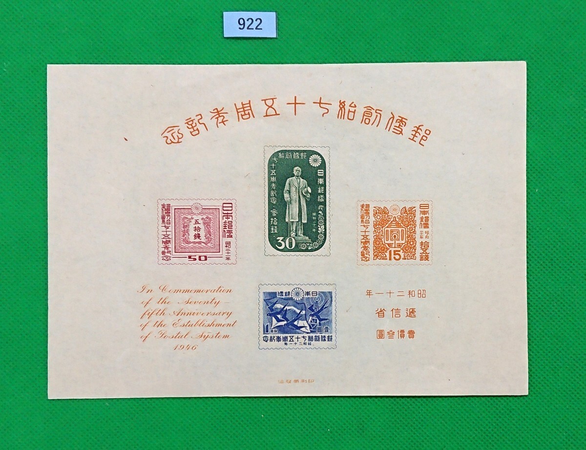 郵便創始75年記念/小型シート/1946年発行/戦後初小型シート/NH/美品/シミ無/シワ無/希少品/カタログ価格28,000円/No.922