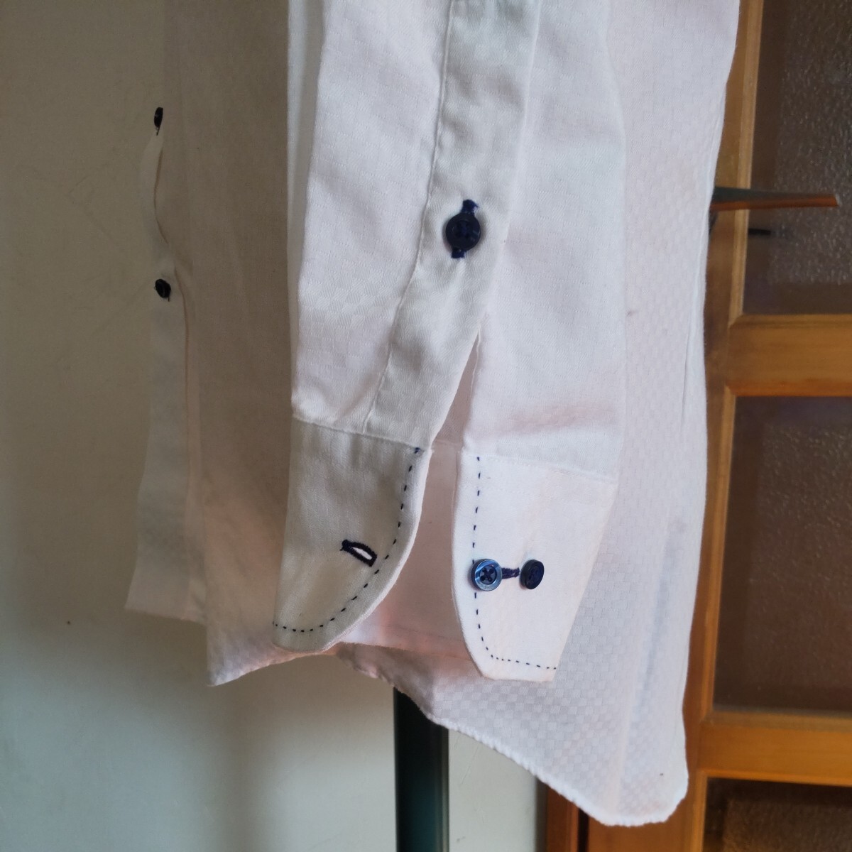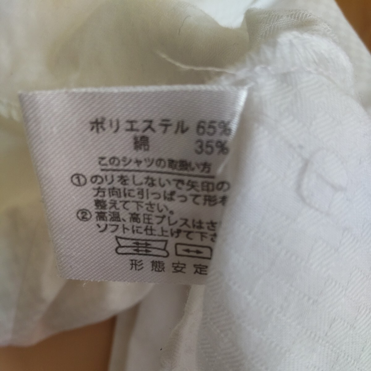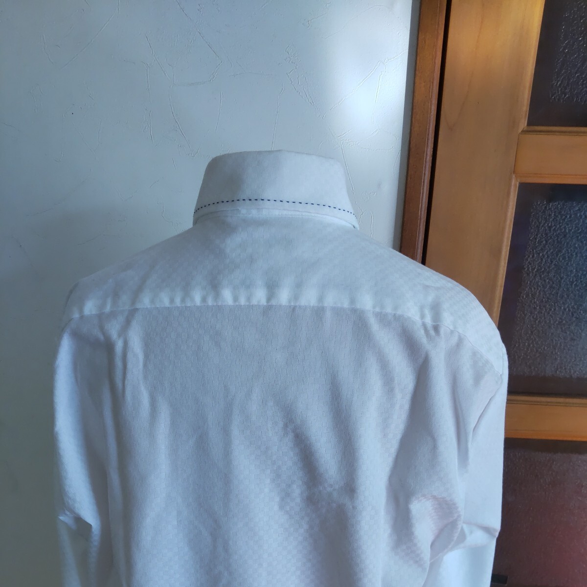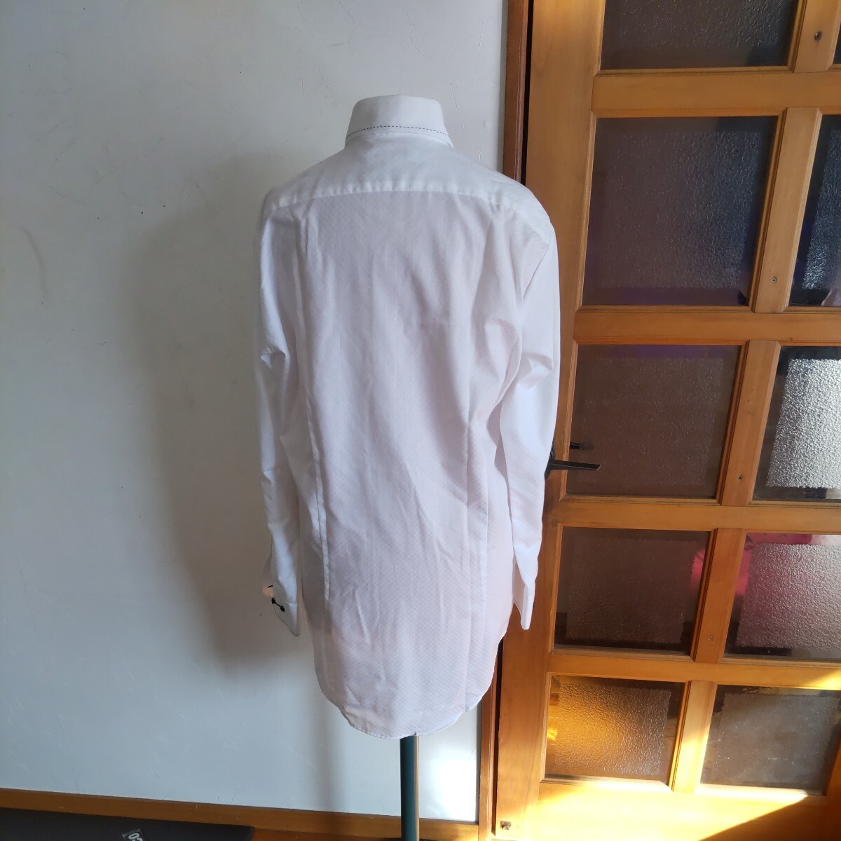 色ホワイト、品質65%ポリエステル35%綿、ポケット1つ、予備ボタン2つ、カフスボタン対応可、サイズ表記M39-80,実寸身幅48cm肩幅43cm袖丈58cm着丈81cmいずれも平置き寸法です。破れや穴無く状態普通とおもいます。細かい市松模様が透かしの様に入ったデザインのノーアイロンシャツです。画像自己紹介御覧になりご検討宜しくお願い致します。