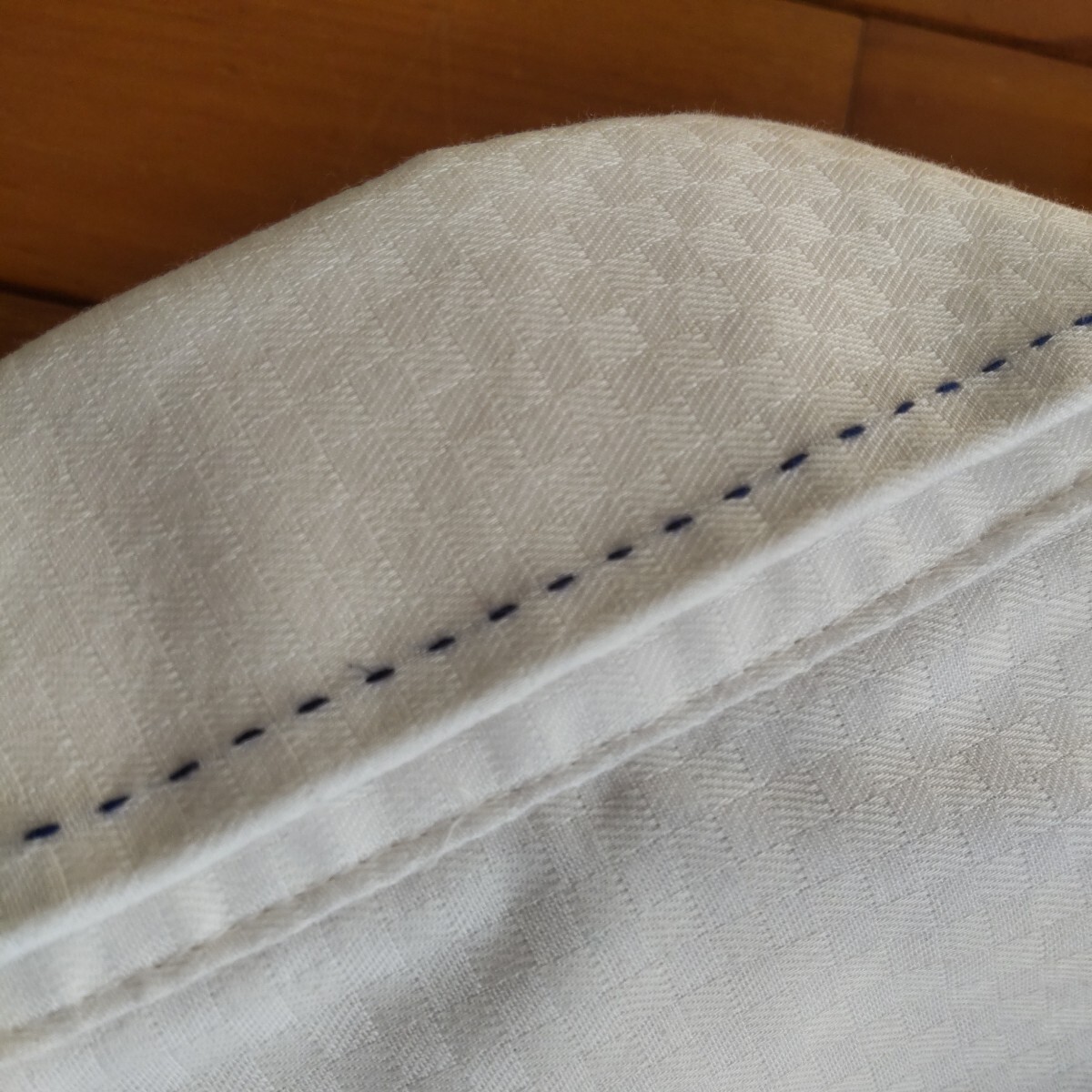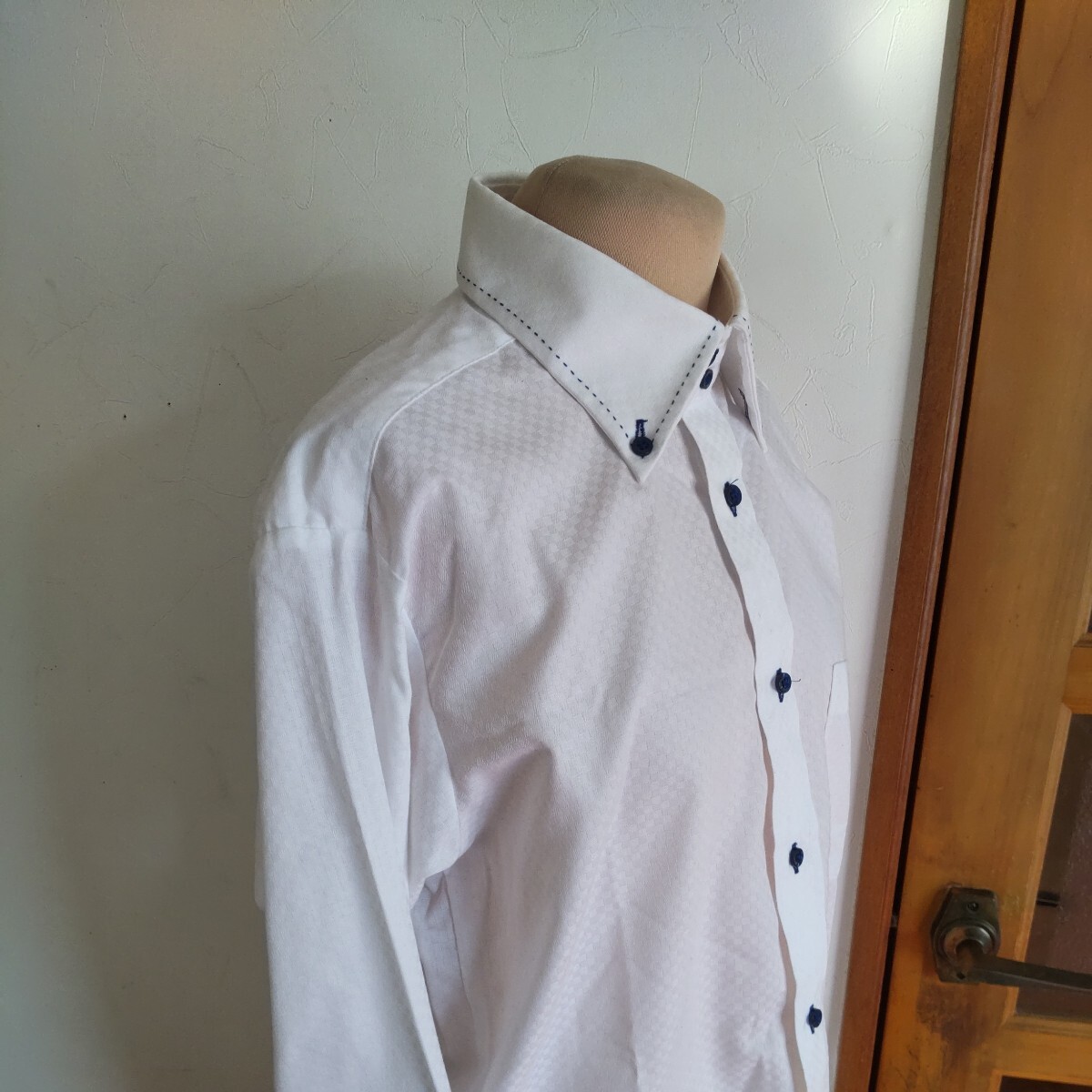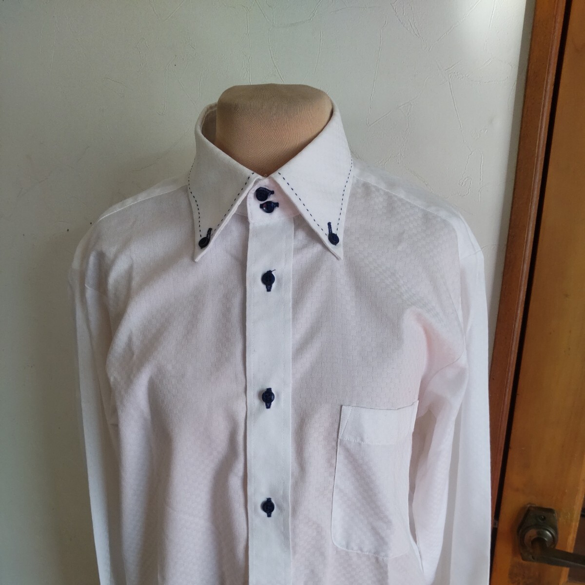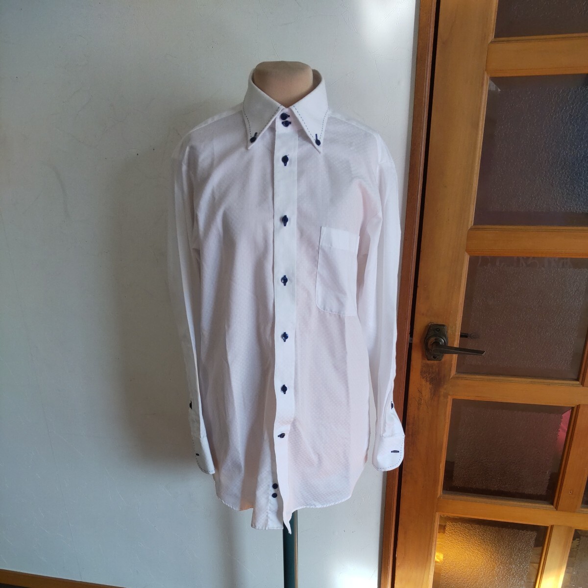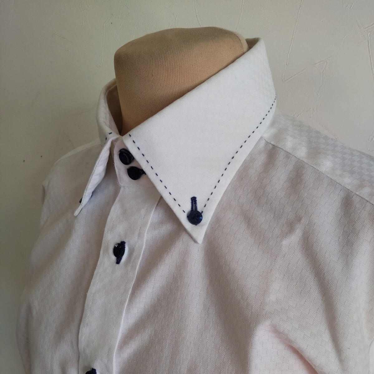 色ホワイト、品質65%ポリエステル35%綿、ポケット1つ、予備ボタン2つ、カフスボタン対応可、サイズ表記M39-80,実寸身幅48cm肩幅43cm袖丈58cm着丈81cmいずれも平置き寸法です。破れや穴無く状態普通とおもいます。細かい市松模様が透かしの様に入ったデザインのノーアイロンシャツです。画像自己紹介御覧になりご検討宜しくお願い致します。