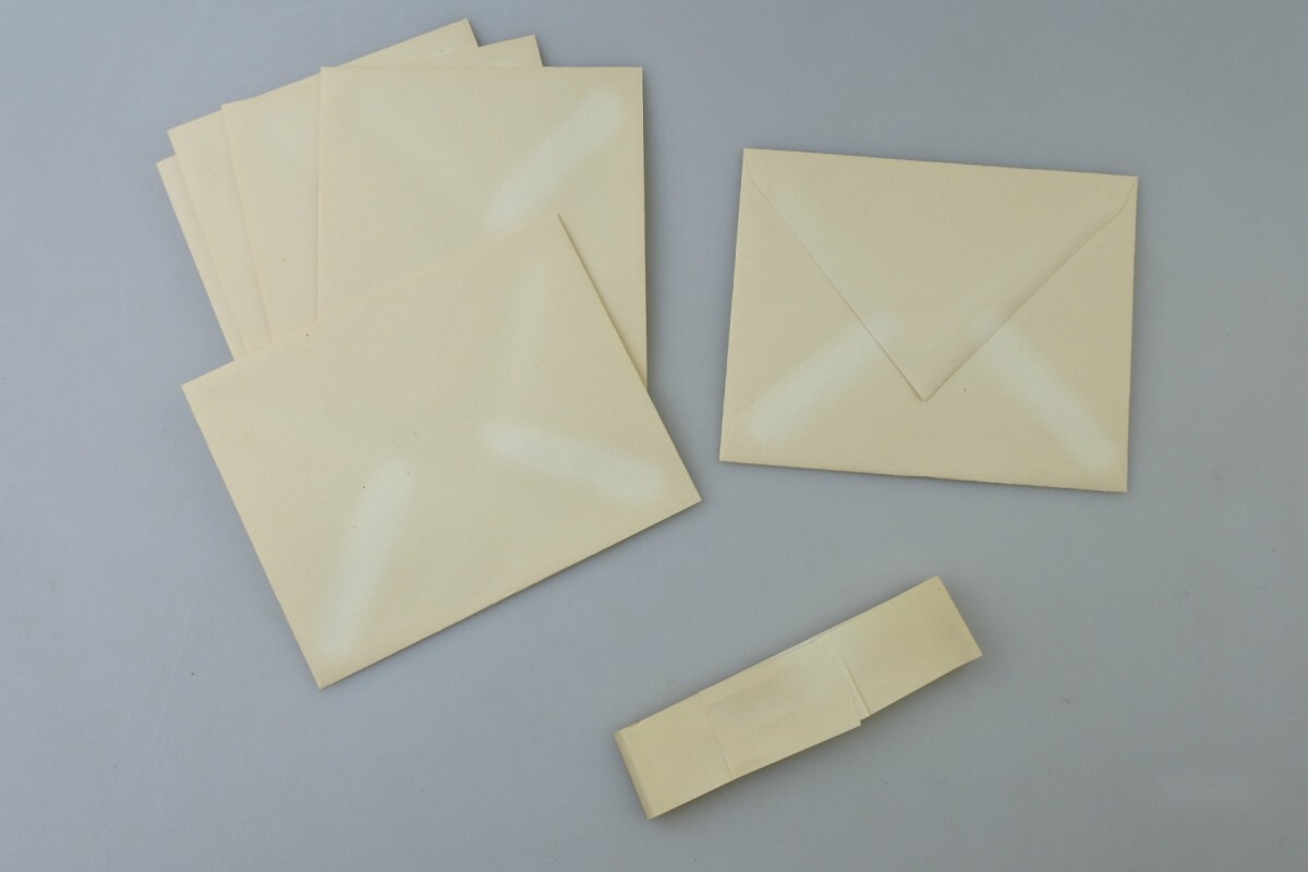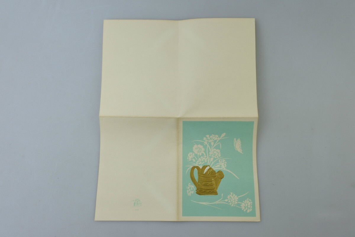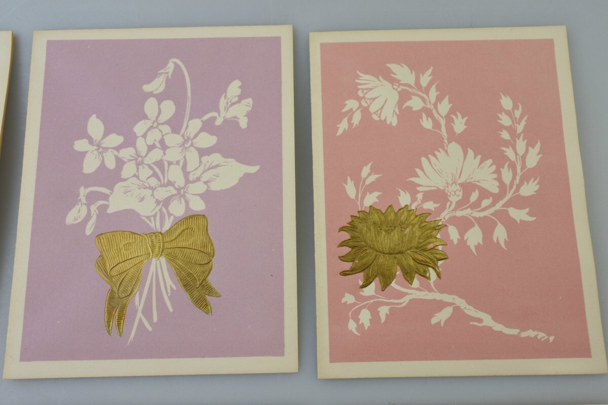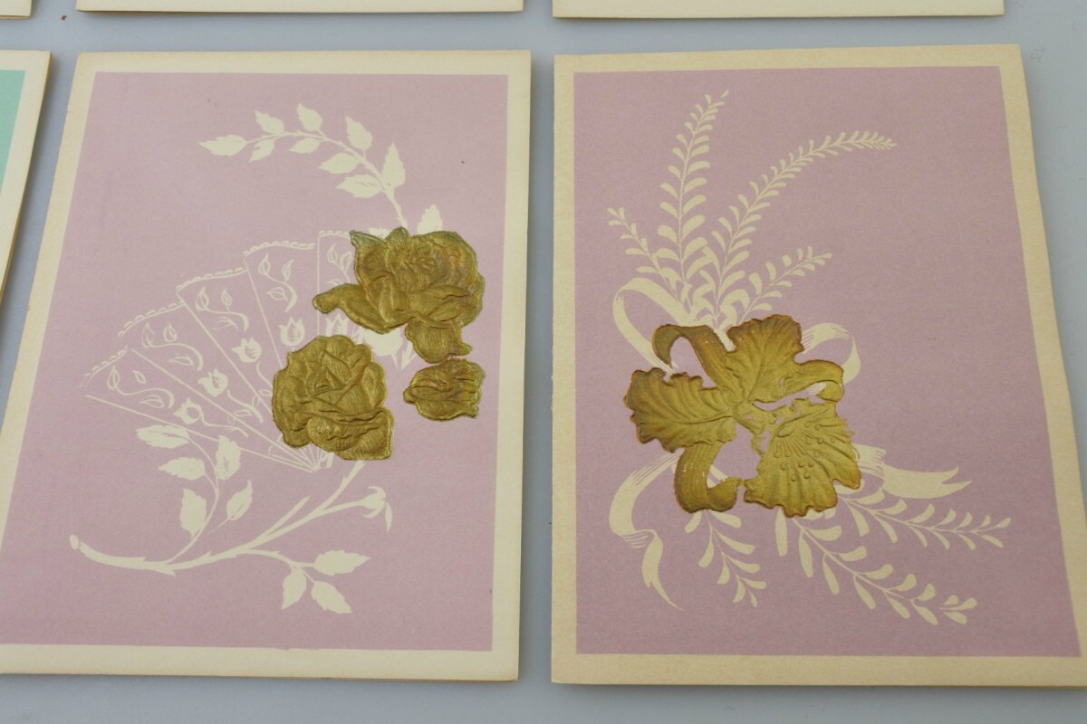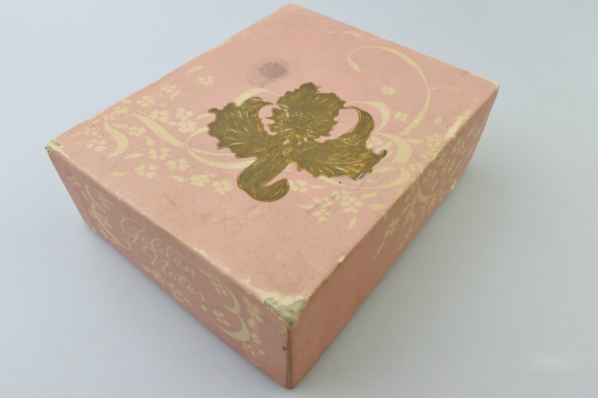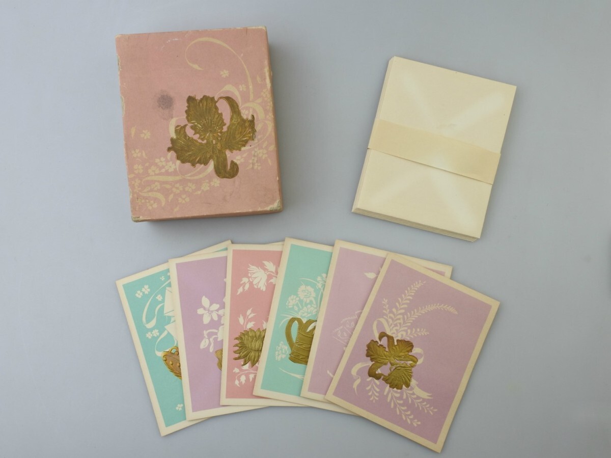 メッセージカードや封筒には経年劣化によるヤケ、ボックスには汚れや擦れ、底には破れがございます。封筒を束ねていた帯は破れてほどけています。また、古書でよく感じるような古い匂いが付着しております。