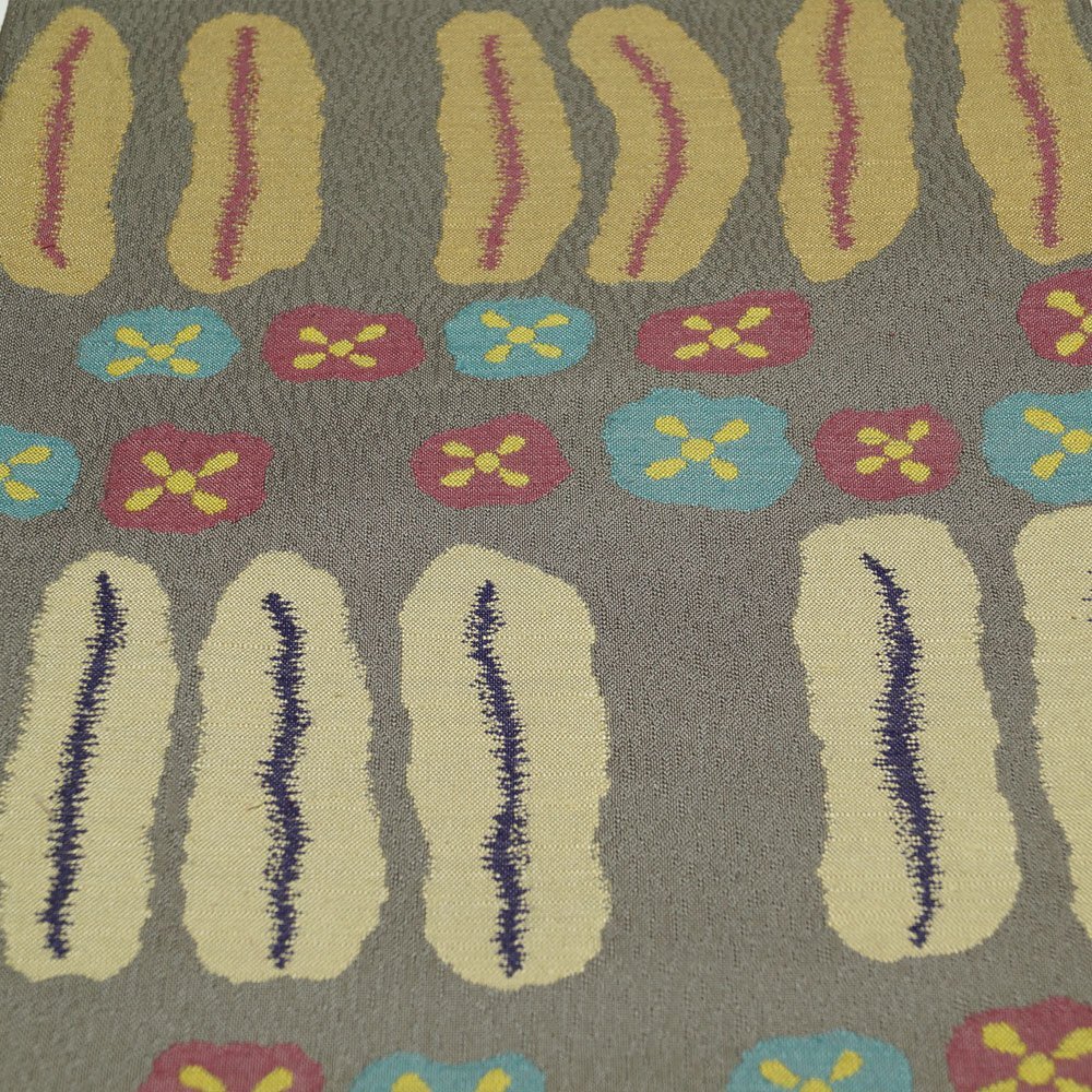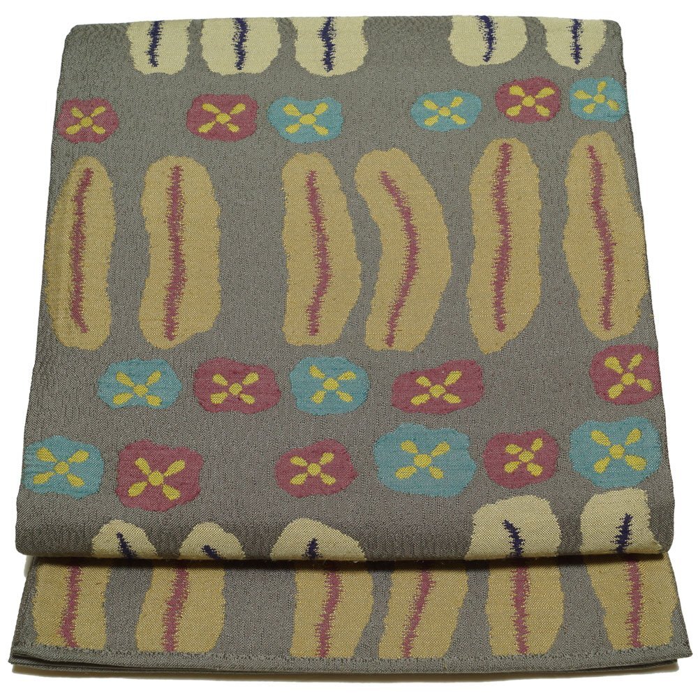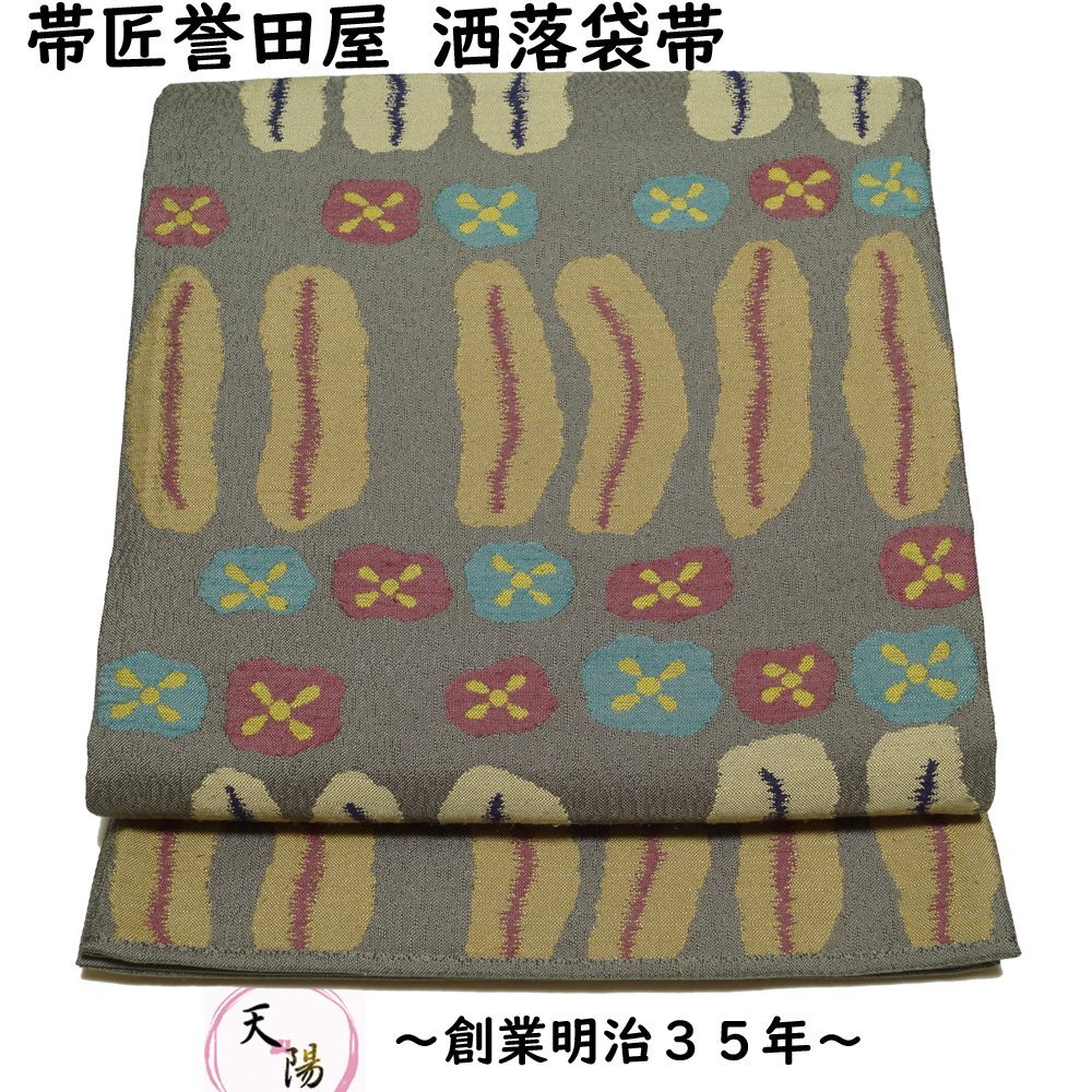 商品 説明 | 木目模様の地織が入った鼠色系の地に、モダンに抽象化された梅花と葉っぱのような模様が織られた洒落袋帯です。垂れ先中に帯匠誉田屋の銘が入っております。誉田屋さんでは珍しいカジュアル向きのモダンな帯となります。名の有る産地ものの紬や、洒落訪問着、小紋などにお召し下さいませ。抽象化された模様となっておりますので、通年お召しいただけます。 |