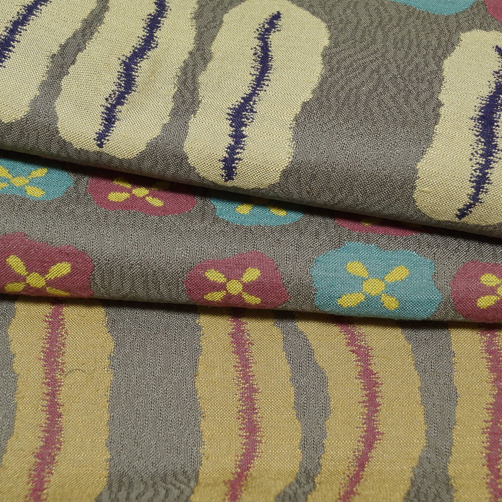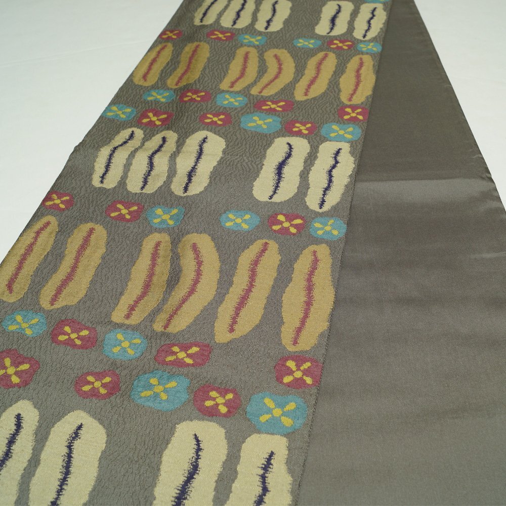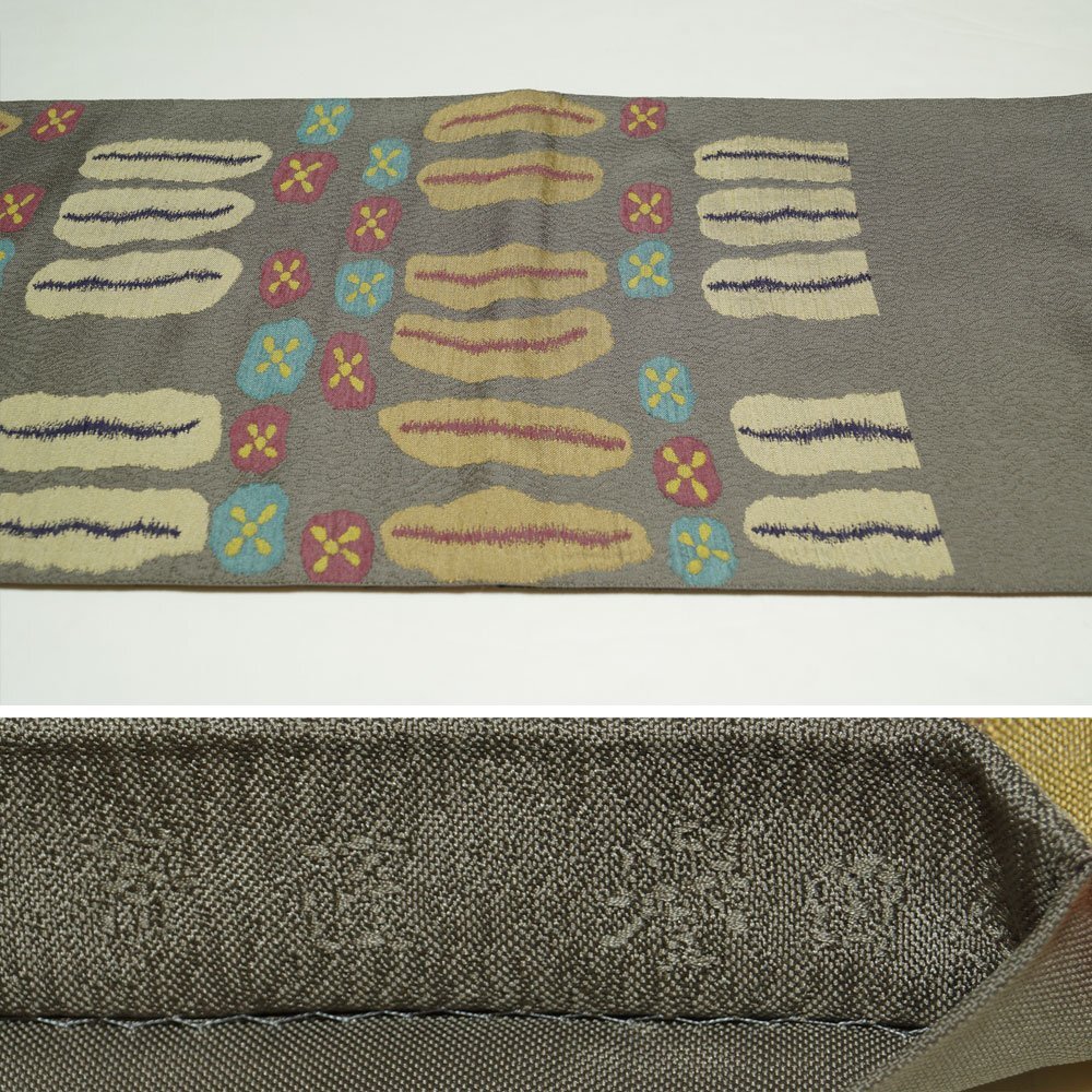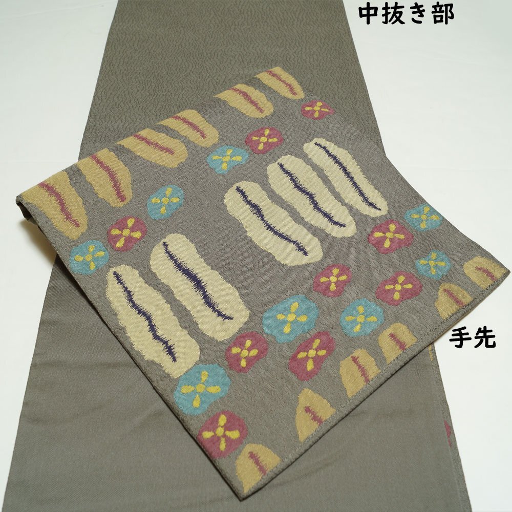 商品 説明 | 木目模様の地織が入った鼠色系の地に、モダンに抽象化された梅花と葉っぱのような模様が織られた洒落袋帯です。垂れ先中に帯匠誉田屋の銘が入っております。誉田屋さんでは珍しいカジュアル向きのモダンな帯となります。名の有る産地ものの紬や、洒落訪問着、小紋などにお召し下さいませ。抽象化された模様となっておりますので、通年お召しいただけます。 |