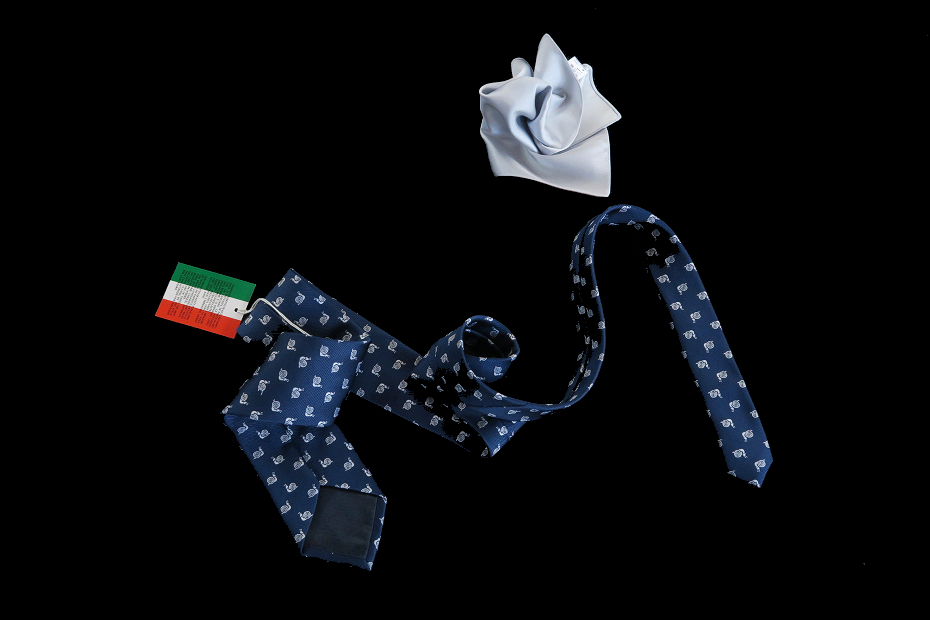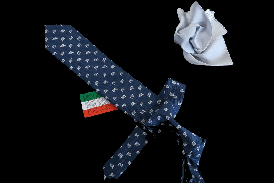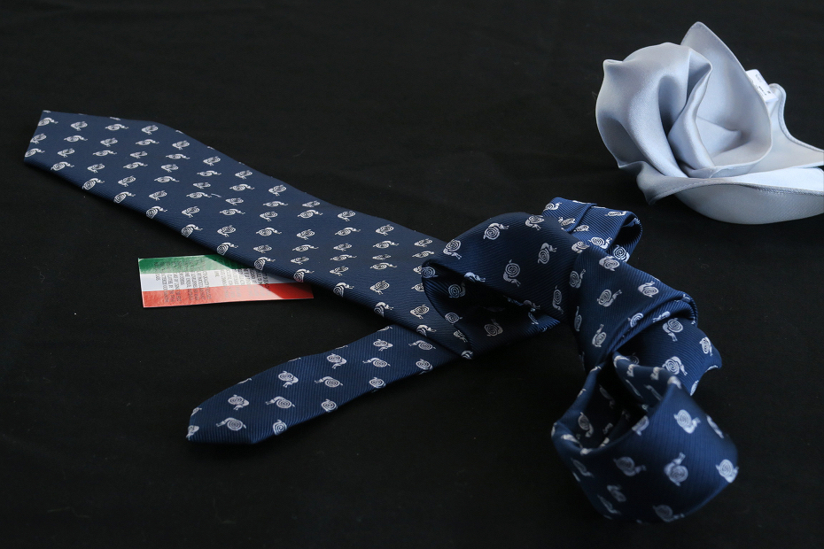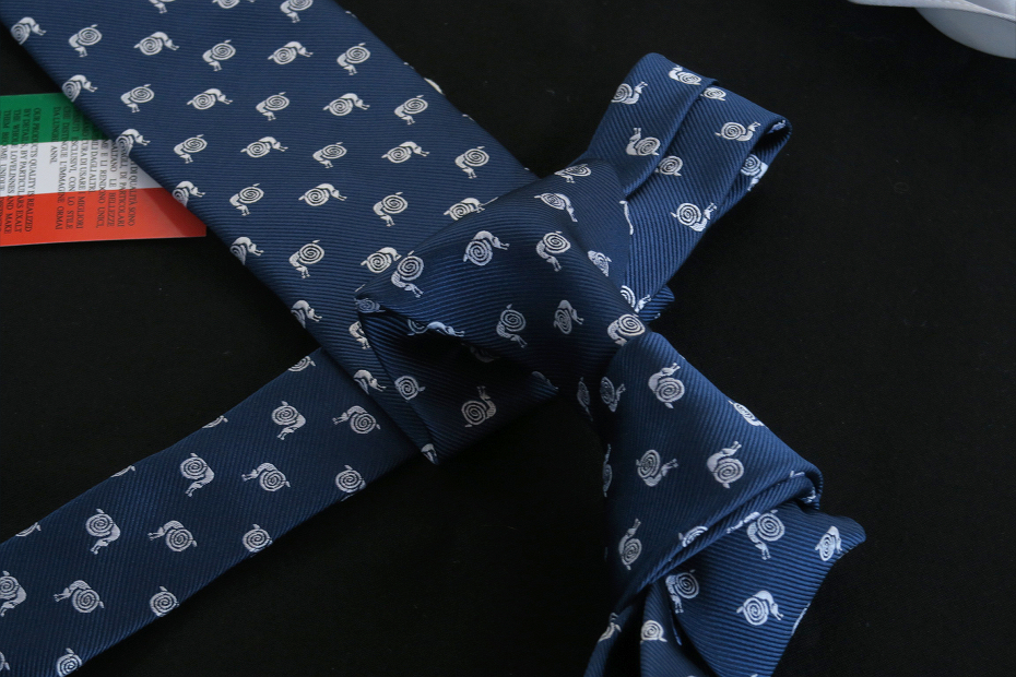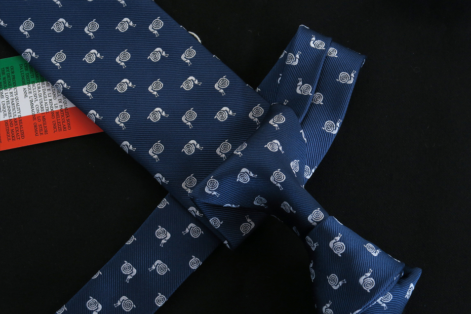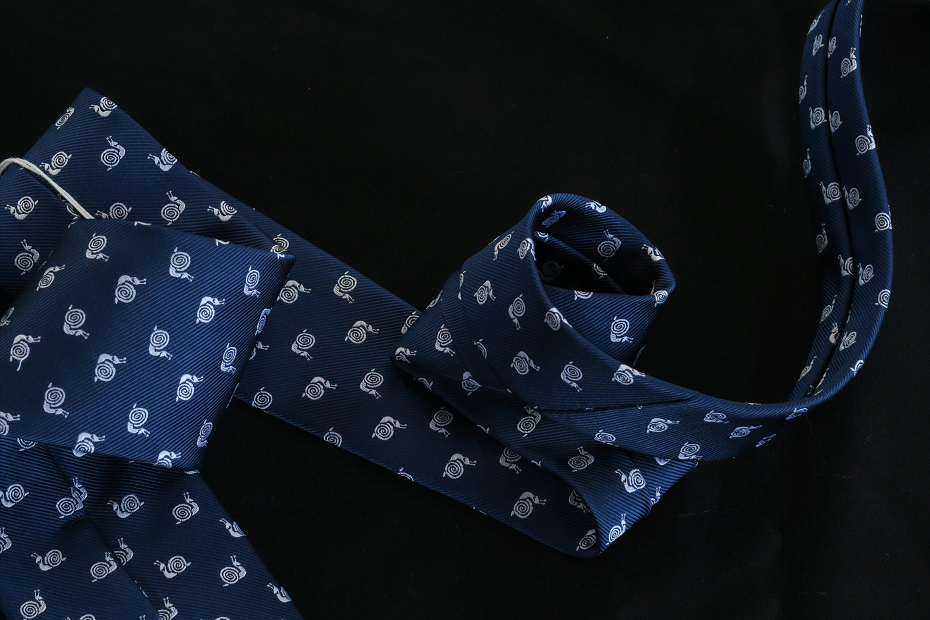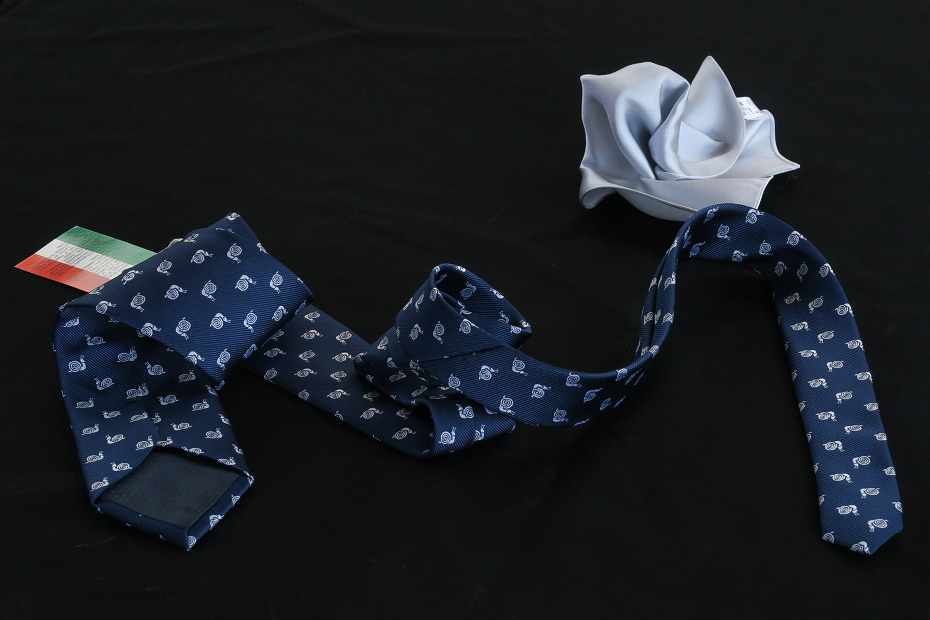 ★イタリアネクタイ COLLEZIONE MARIO A ROMA_168 Piano Piano ブルーに白く蝸牛かたつむり ポケットチーフ付いてきます・・(^_-)-☆