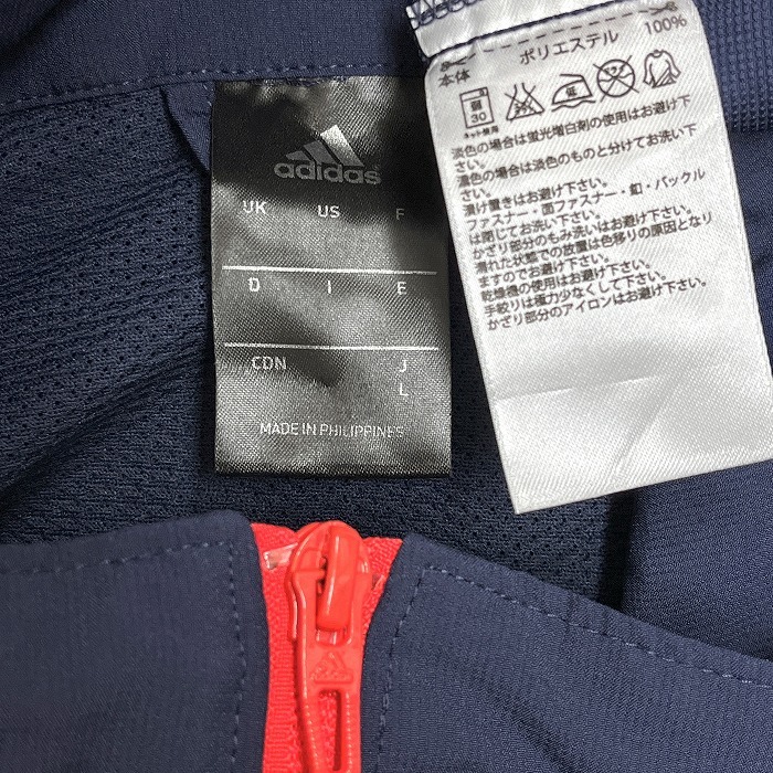 | 商品タイトル | アディダス adidas 薄手 ジャケット 背中と脇がメッシュ生地 ラグラン 長袖 ロゴプリント ハイネック ポリ100% L ブルー 青×赤×白 メンズ |