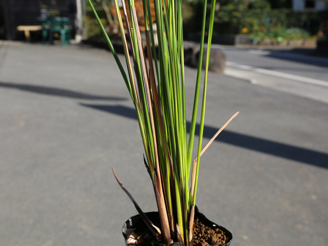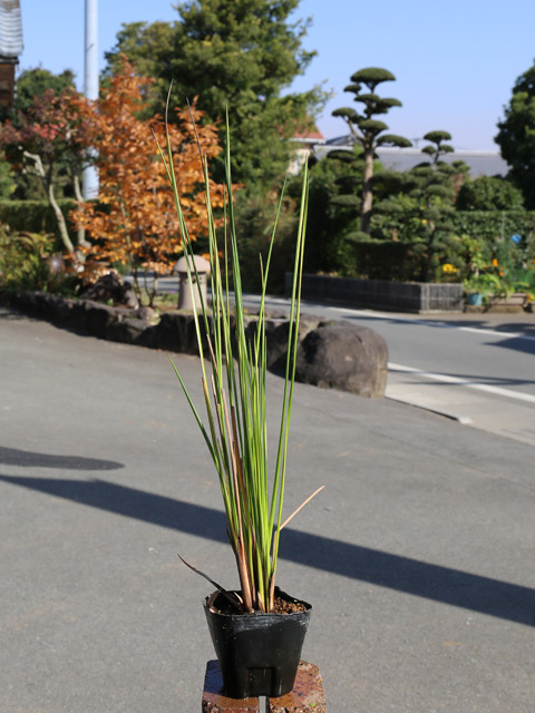 【商品情報】アンペライ斑入りは1.2mになる湿性植物です。葉は平たい剣状です。花は赤褐色の穂状花穂をつけます。関東以西の西日本の水辺に稀に見られる抽水植物です。地下茎が横に広がり、葉は根生して直立します。葉とほとんど同じ形態をした桿も伸びてその上部には初秋の頃に赤褐色の花が多数つきます。