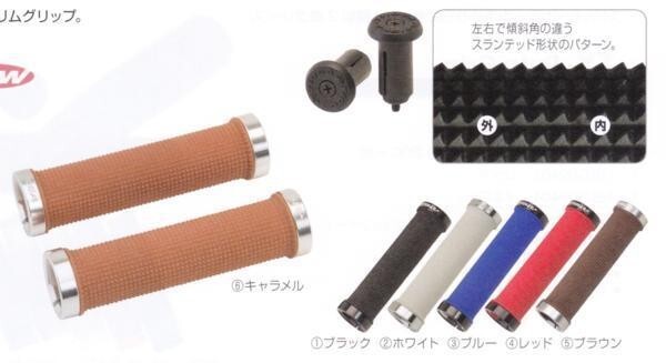 | 商品説明 | ・カラー:キャラメル ・両端を2.5mm六角レンチで固定するロックオングリップ。 ・耐候性に優れたVEXKラバーを採用。 ・VEXKラバー+ナイロン(インナー) ・スランテッドダイヤモンドパターン ・アルミ合金ロックオンシステム 内側:7.5mm幅ロックリング 外側:8.5mm幅ロックリング ・オープンエンド ・エンドプラグ付属 ・長さ:124mm ・125g/ペア |