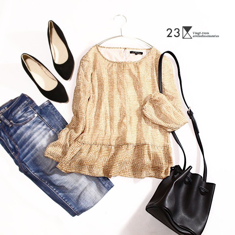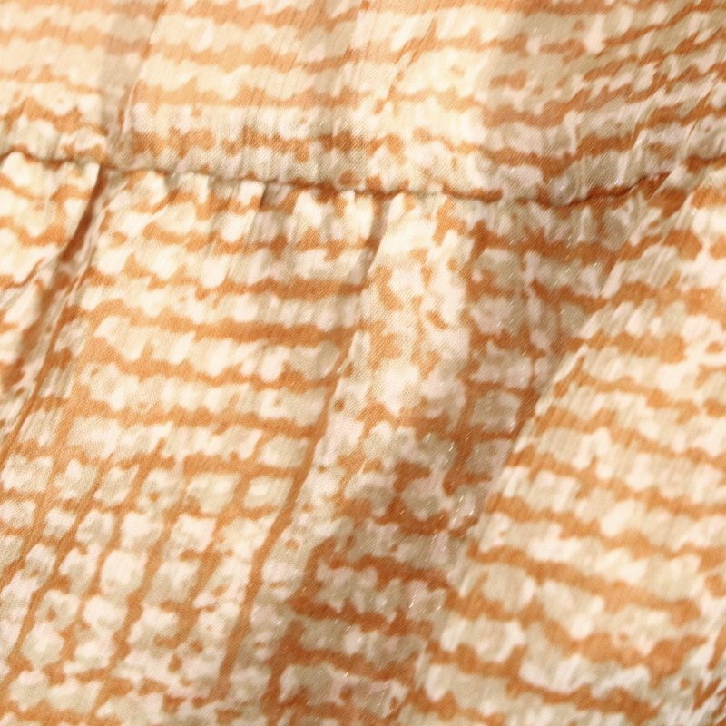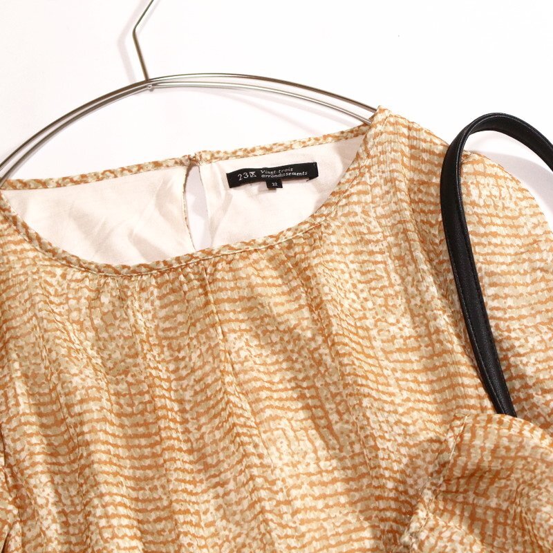美品 23区 株) オンワード樫山 春 夏 ほんのりラメ 艶 総柄 小さいサイズ32 小柄 長袖 シフォンカットソー ブラウス XXS 3号 ブラウン