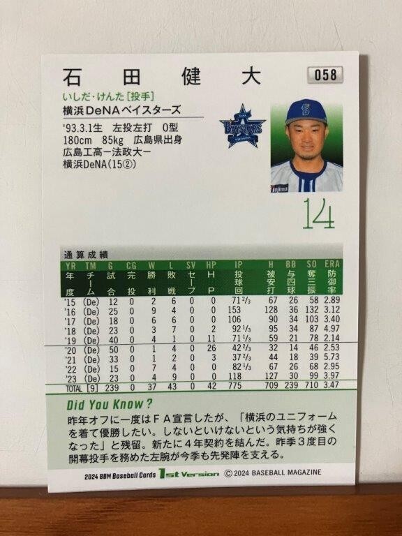 【2024 BBM 1st】058石田健大(横浜DeNAベイスターズ)レギュラーカード