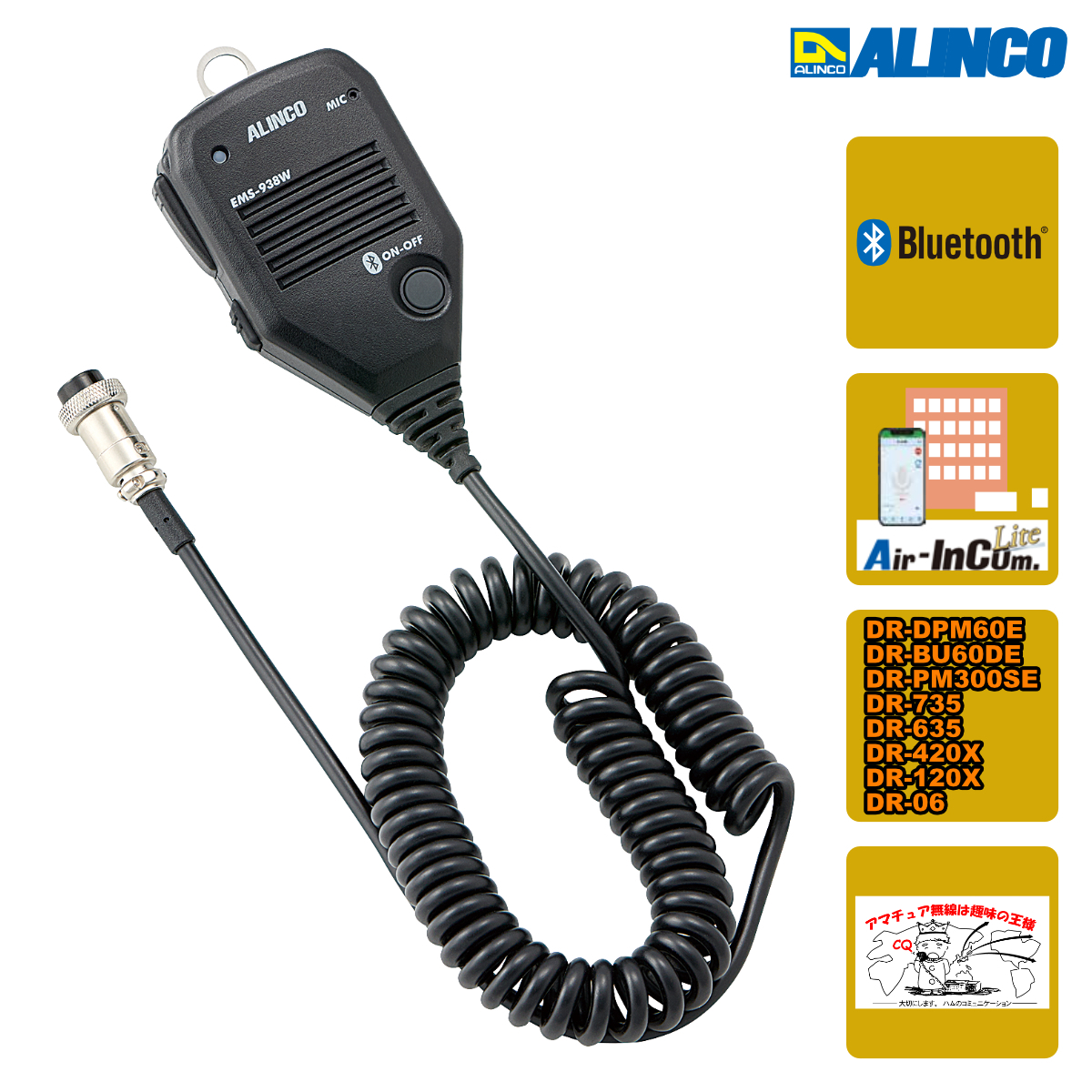 アルインコ製の車載無線機とアプリ無線の「エアーインカムライト」、2系統の通信をマイク一本で可能にします。