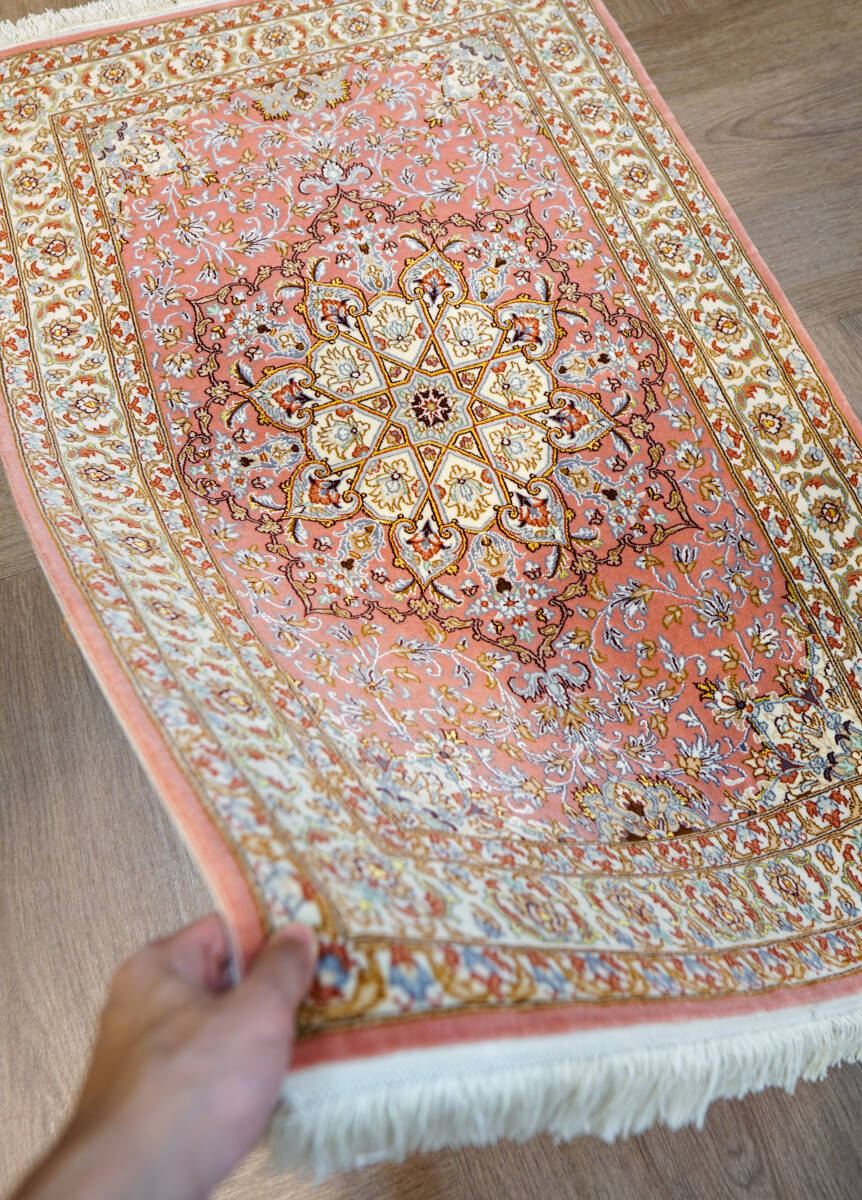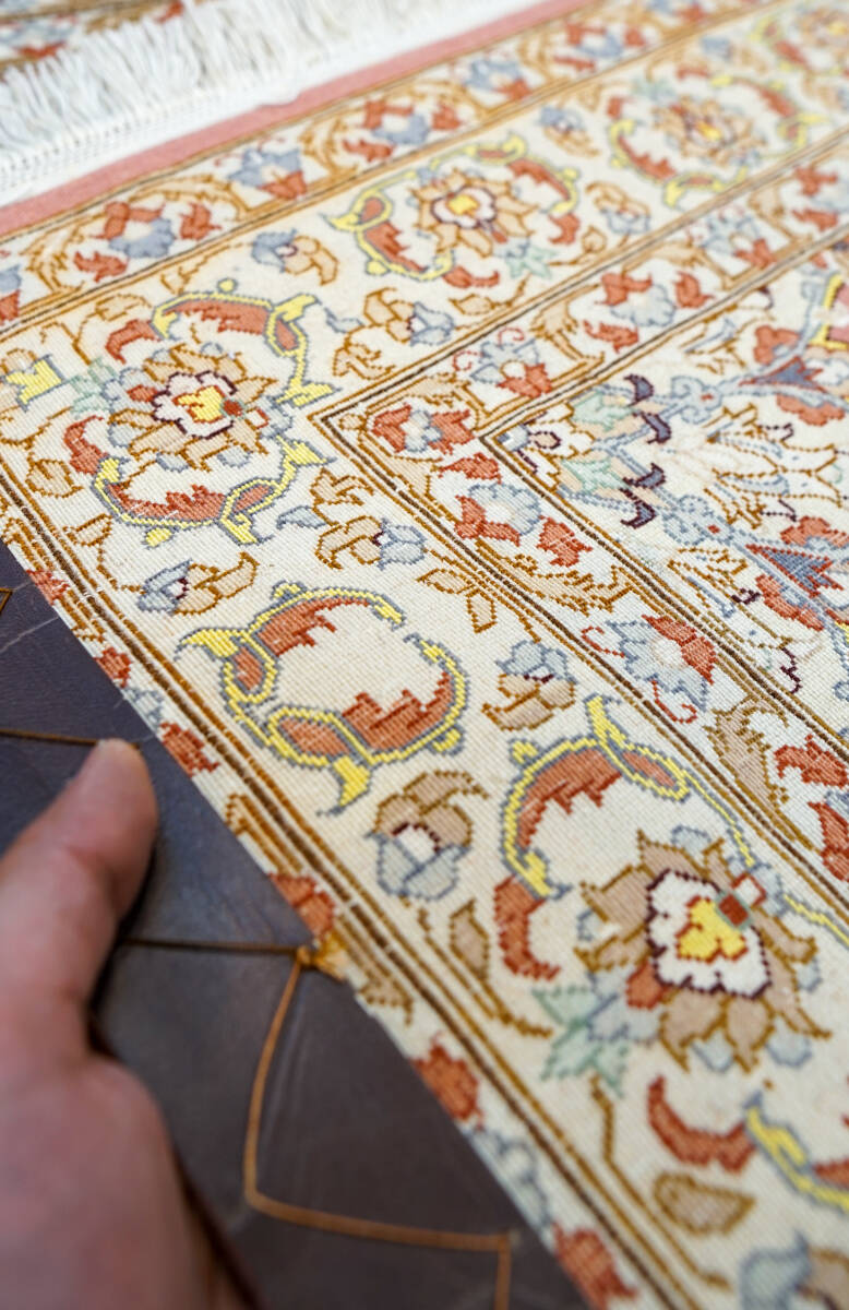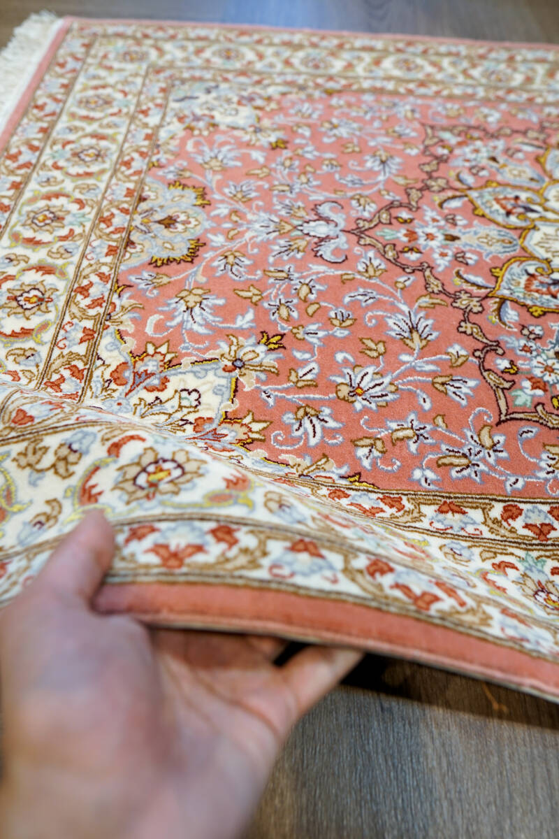 コールクウールという生まれて1年以内の子羊から刈り取った貴重なウールとシルクで織り上げた大変柔らかい絨毯です。