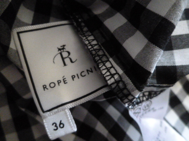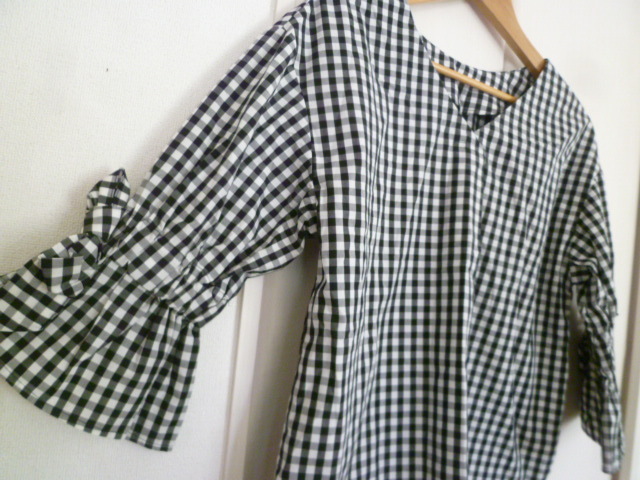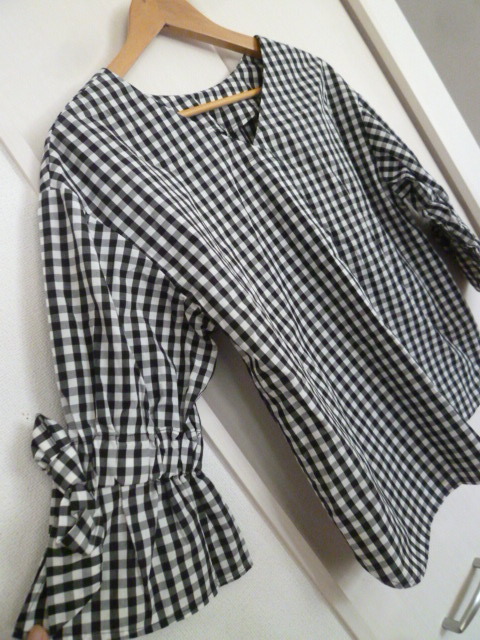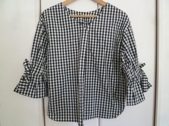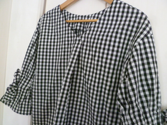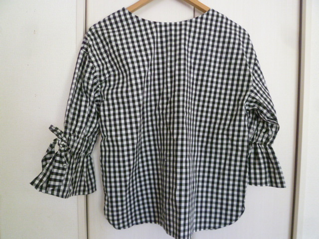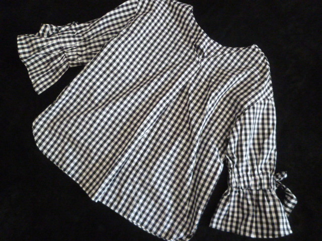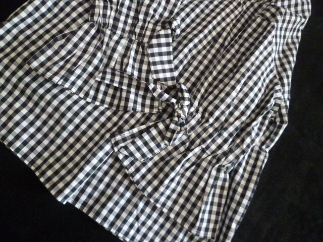 Rope Picnic/ロペピクニック◇黒×白ブロックチェック柄ベル袖リボンブラウスカットソー36◇ブラックホワイトジュン◇a71