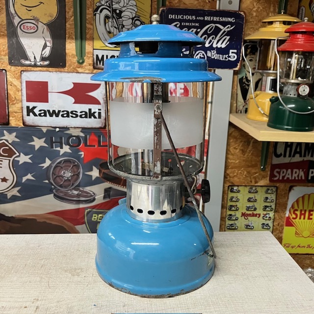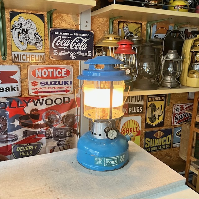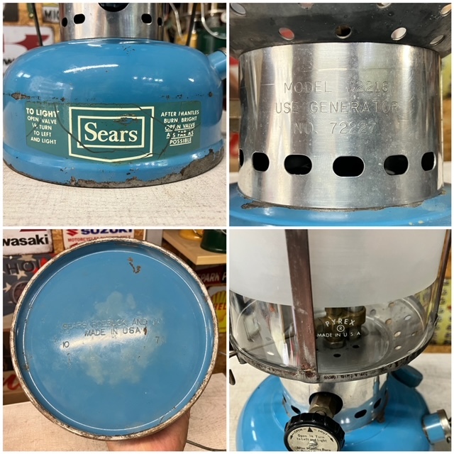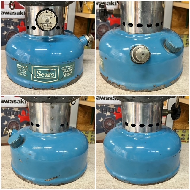 シアーズランタンとは、70年代にアメリカの大手百貨店のSearsがColemanにOEM生産を依頼しシアーズの名前で店頭販売していたランタンです。シアーズは既に倒産しており貴重なコレクションランタンの一つです。こちらはシアーズブルーが美しい220タイプのツーマントルモデル72216です。グローブもオリジナルのシアーズ専用グローブです。1970年10月製です。シアーズブルーモデルは3モデルありますが、このモデルは1970年~1971年の二年間だけの生産です。着火確認、点灯検査済みで良好です。