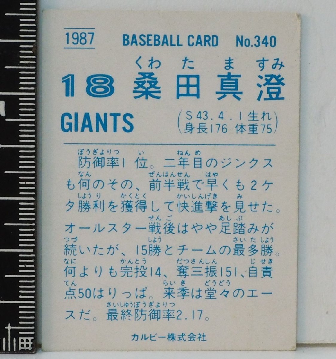 87年 カルビー プロ野球カードNo.340金枠【最優秀防御率 桑田 真澄 読売ジャイアンツ巨人】昭和62年1987年 当時物Calbeeおまけ食玩【中古】