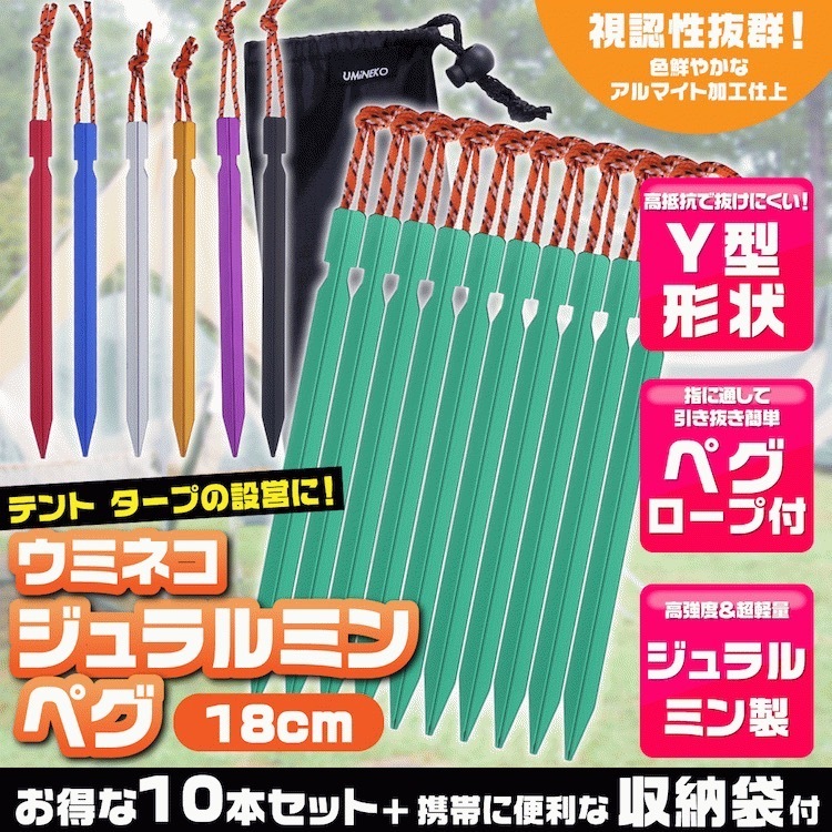 テント設営に便利なペグ10本が1セットになっています。色鮮やかなペグはファッション性だけでなく、地面上で映え、紛失や脚の引っかけ防止にも役立ちます。
