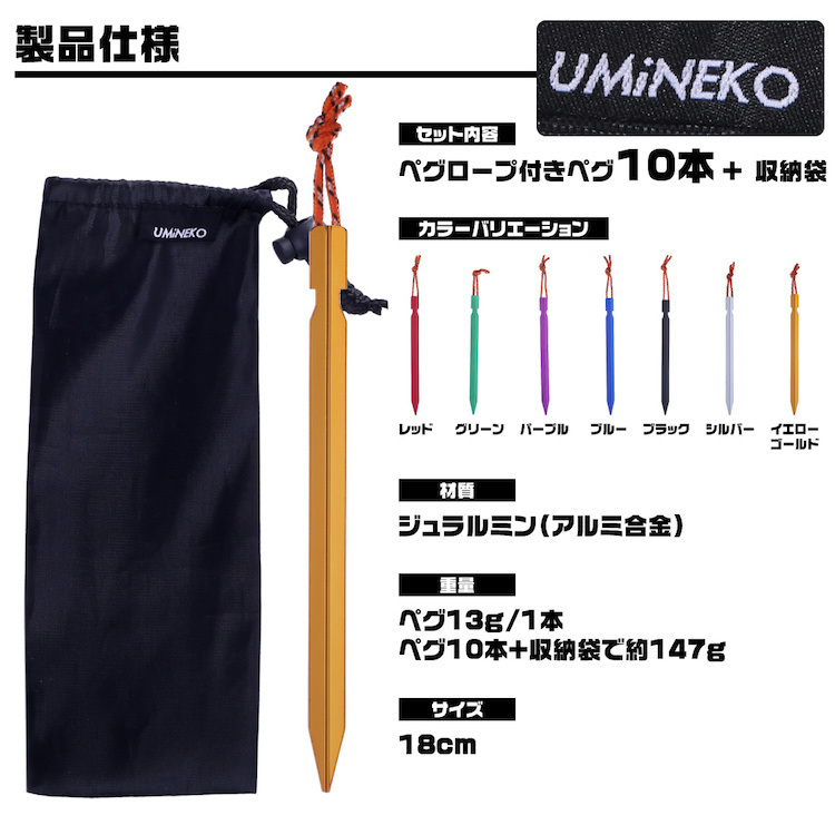 重量:ペグ13g/1本 ペグ10本+収納袋で約147g
