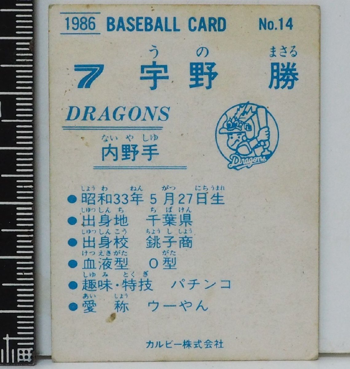 86年 カルビー プロ野球カード No.14【宇野 勝 内野手 中日ドラゴンズ】昭和61年 1986年 当時物 Calbee おまけ 食玩 BASEBALL【中古】