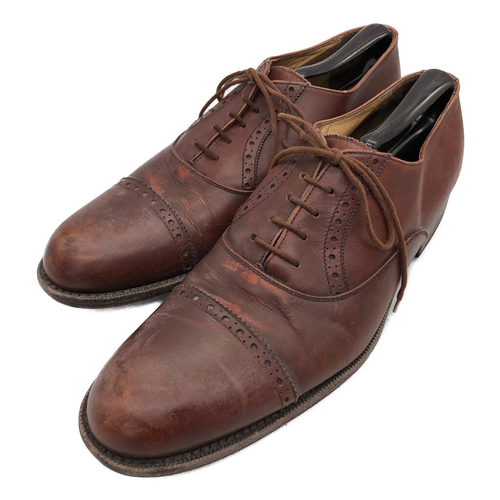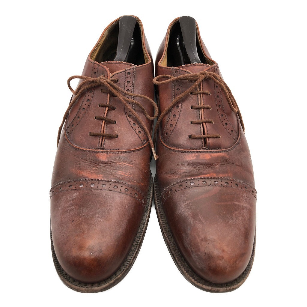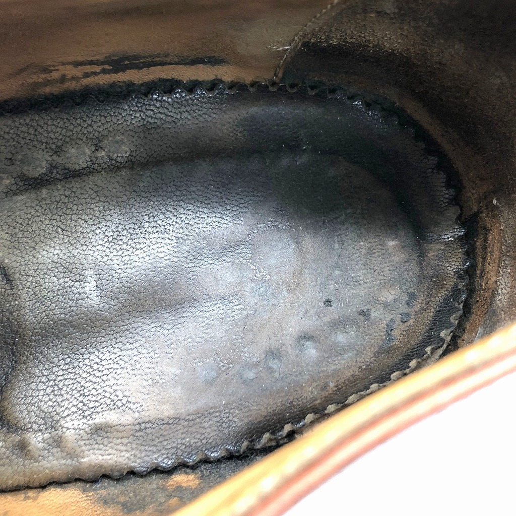 | [商品管理番号] KA0950 [サイズ] 28〜28.5cm相当 [実寸サイズ] (アウトソール)全長:約31cm 最大幅:約10cm 最小幅:約7cm ヒール高さ:約3cm [主な素材] [色] レッドブラウン [仕様] 内羽根式 本革 セミブローグ [状態] 汚れ: インソールの黒ずみあり キズ: 全体的にスレあり 破れ: 左足かかと内側に破れあり 特記事項: 全体的に変色箇所あり/両足ヒールの減り若干あり | |||