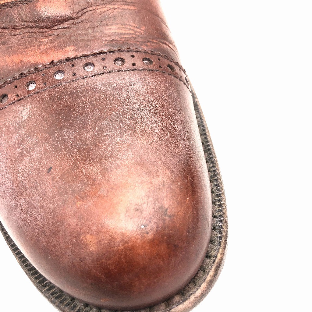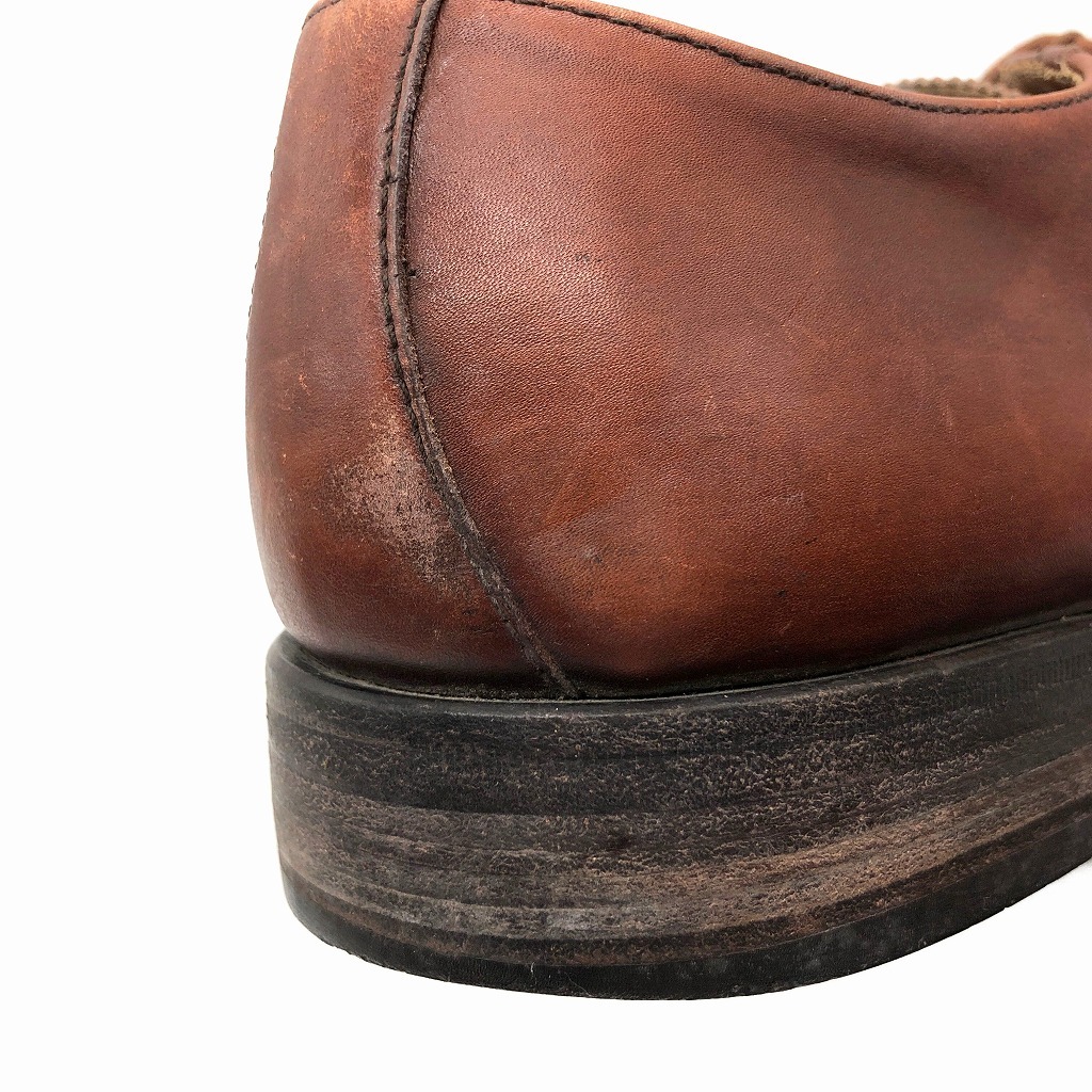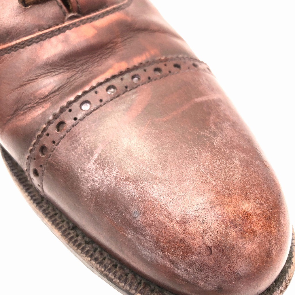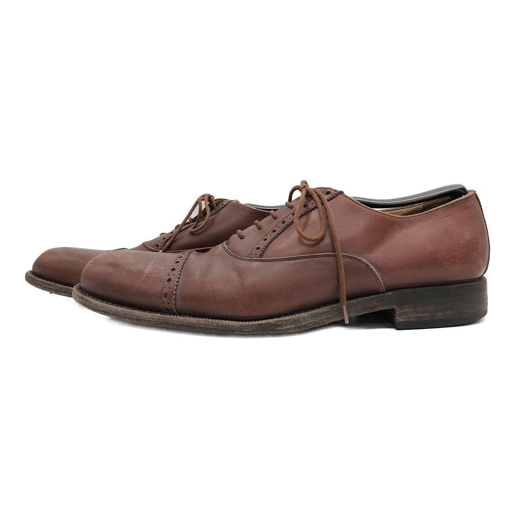| [商品管理番号] KA0950 [サイズ] 28〜28.5cm相当 [実寸サイズ] (アウトソール)全長:約31cm 最大幅:約10cm 最小幅:約7cm ヒール高さ:約3cm [主な素材] [色] レッドブラウン [仕様] 内羽根式 本革 セミブローグ [状態] 汚れ: インソールの黒ずみあり キズ: 全体的にスレあり 破れ: 左足かかと内側に破れあり 特記事項: 全体的に変色箇所あり/両足ヒールの減り若干あり | |||