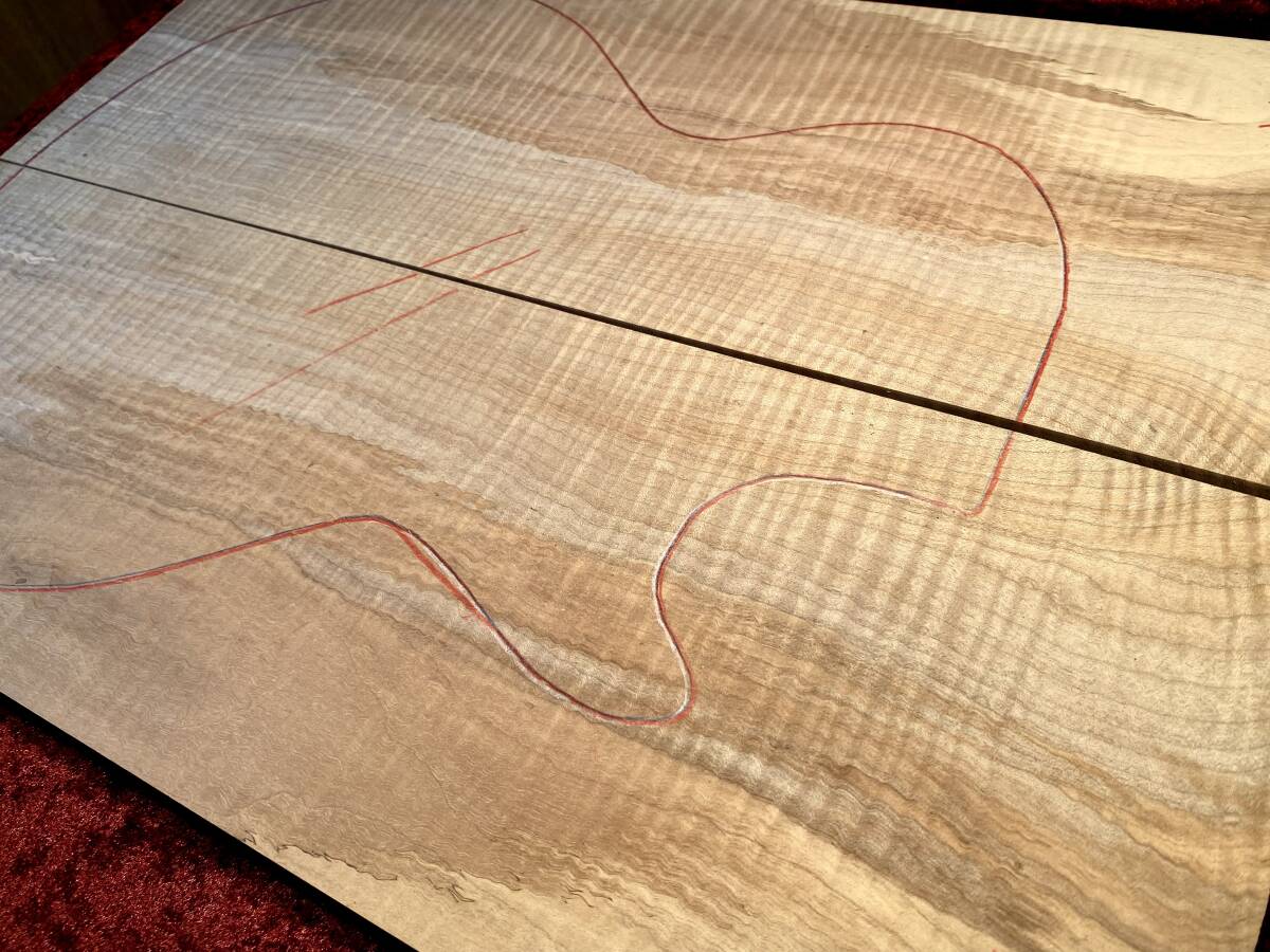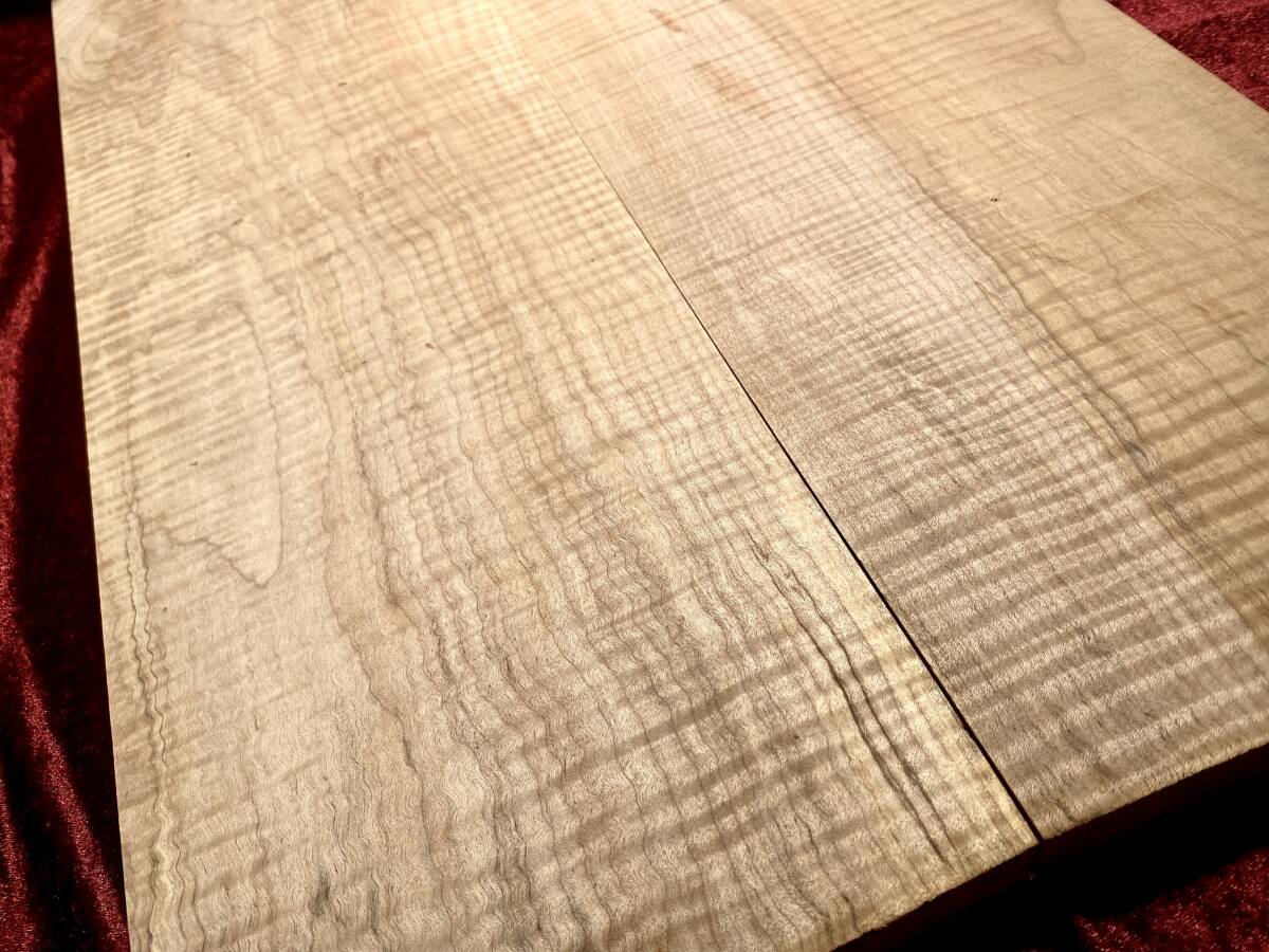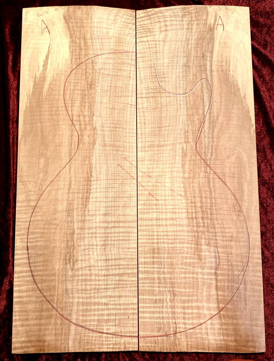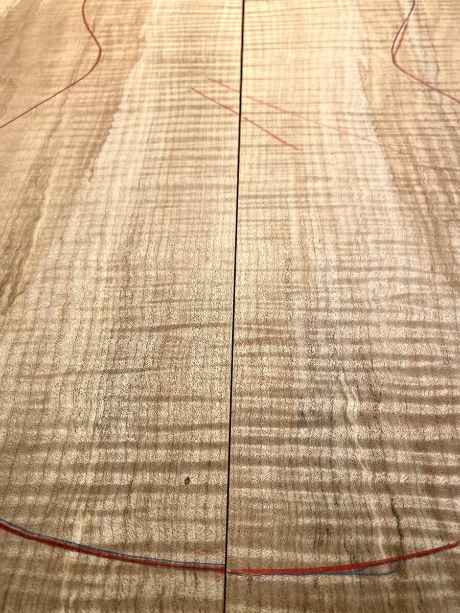 大切にストックしていたアーチトップ用のハードメイプル 柾目ブックマッチ(ボディトップ材)になります。