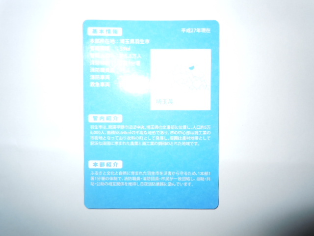 消防カード 埼玉県 羽生市消防本部 非売品です。 頂き物のため微小の傷、汚れ等有り得ますので神経質な方、新規の方の入札はご遠慮ください。 ノークレーム、ノーリターンでお願いします。 他にも出品しています。