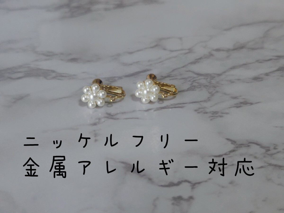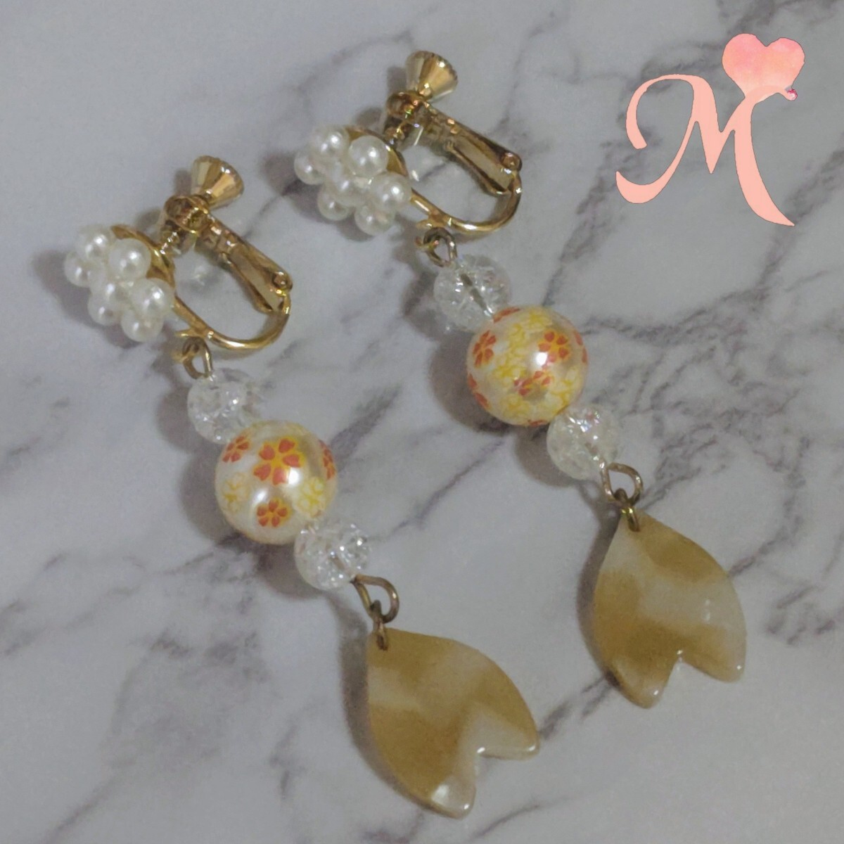 ハンドメイド 金属アレルギー対応 イヤリング or ピアス 花 桜プリントビーズ 水晶 桜の花びら 桜