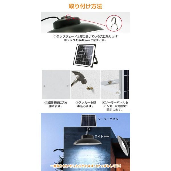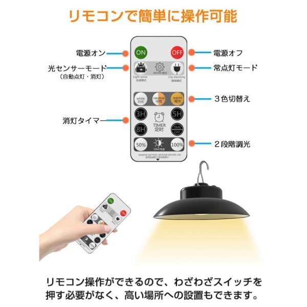 太陽光ledライトは昼光色(6000K)、昼白色(4000K)と電球色(3000k)との3色が切り替えます。照明輝度は2段階に調節できます。3時間、5時間、8時間のタイマー点灯が設定可能です。