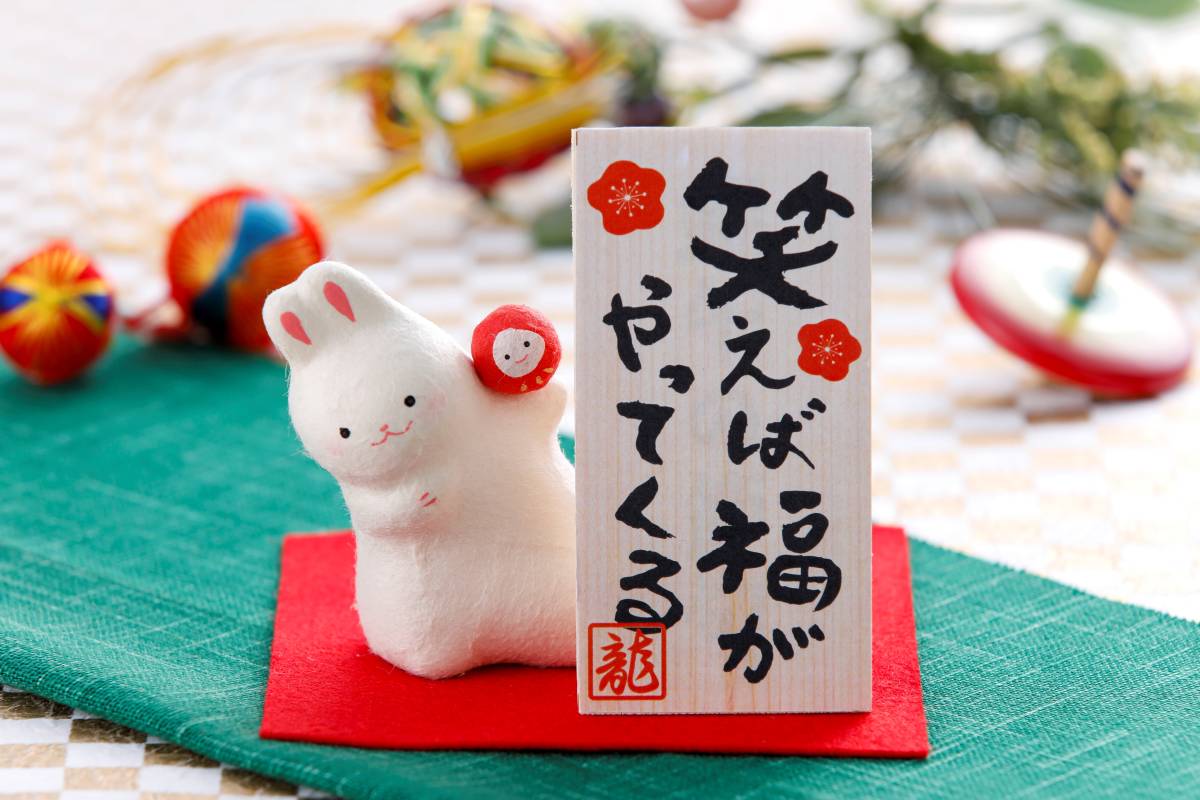 干支人形 兎 うさぎ ウサギ 卯 リュウコドウ 龍子堂 (約)飾り時:9×9×高さ7.8cm、干支:4×5.5×高さ6.1cm、毛せん:9×9cm、立札:7.7×幅4×奥行3cm