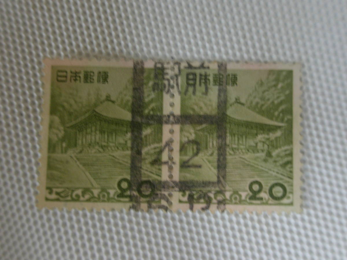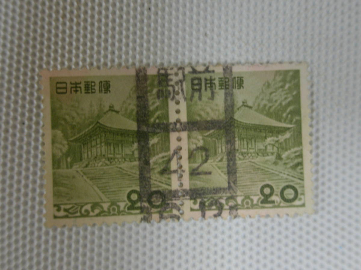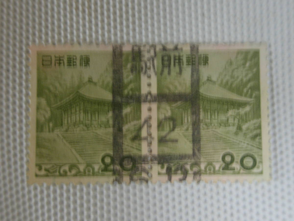 普通切手 1950-1965 動植物国宝図案切手 Ⅱ.第2次動植物国宝切手 (円位) 中尊寺金色堂 20円切手 横ペア 使用済 梯子印 ローラー印