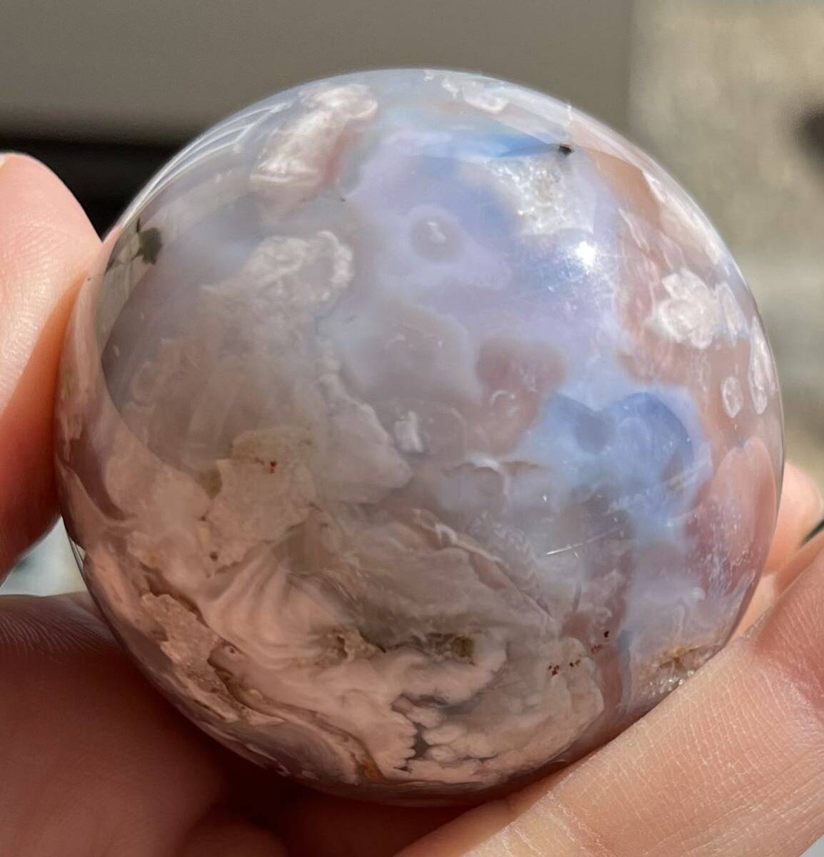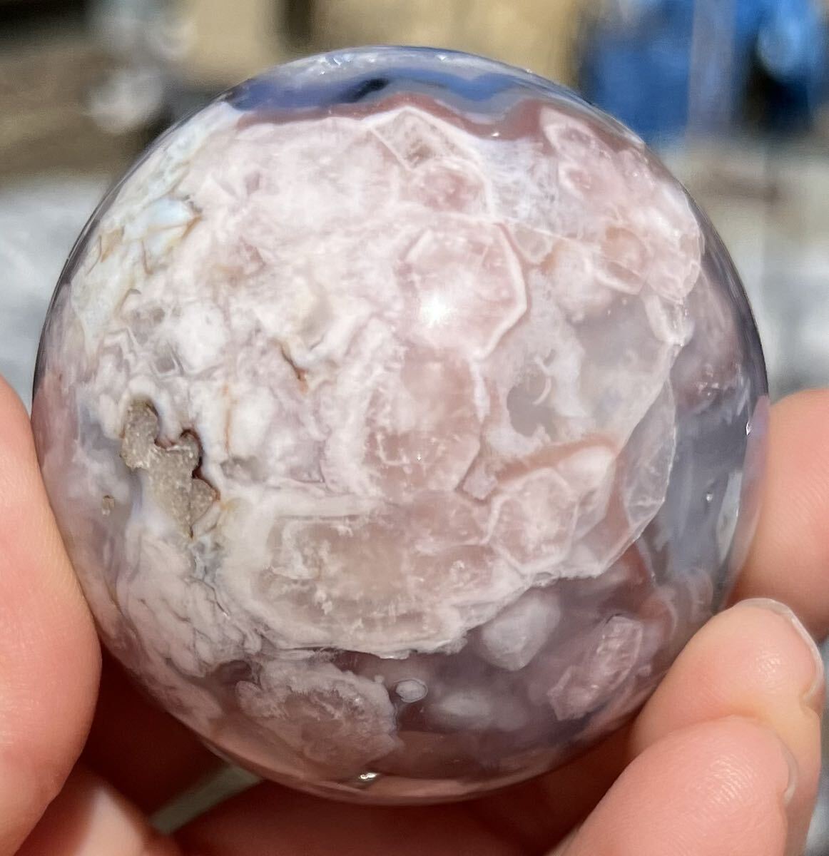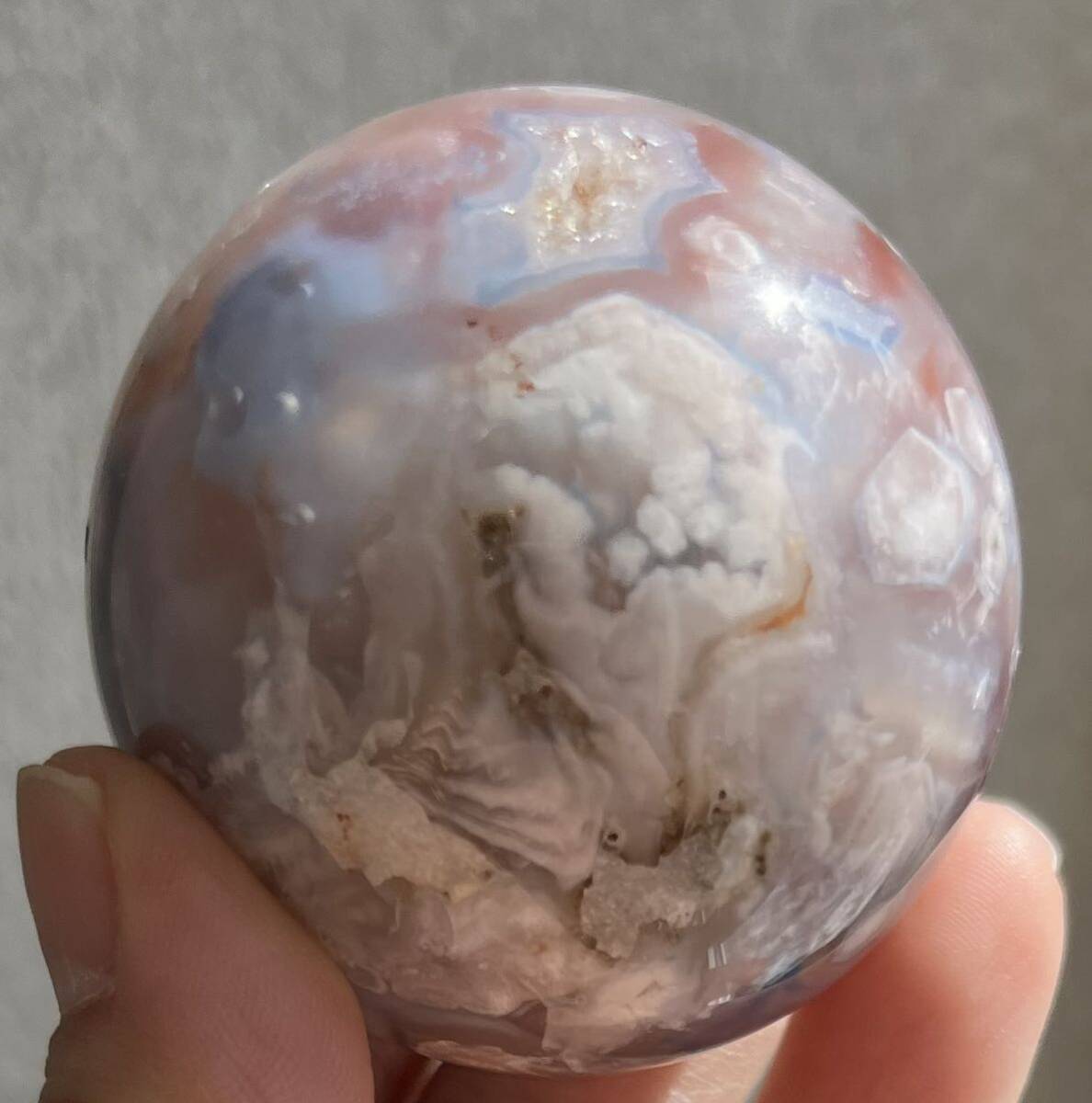約51mm玉 重さ177.9g ご覧の様に美しいフラワーアゲ-トです。桜瑪瑙(さくらめのう)は、運気の流れを良くする意味と効果があります。 厳しい状況から抜け出す、チャンスを作るパワーストーンです。 「希望の光」を求める時、暗い過去から、明るい未来へ導くお守りです。 桜瑪瑙は、魔除けの意味と効果もあります。 周囲に漂う、邪悪なエネルギーを防ぐパワーストーンで持ち主へのダメージを、最小限に抑えてくれます。 穏やかな日々を望む時に効果を発揮してくれるでしょう。浄化してお届け致します。小さくドル-ジ-ホ-ルが数ヶ所有り光があたるとキラリとします。天然石ならではのナチュラルラック等ある場合がございます。人為的傷等ございません。尚他のカテゴリーにも同じ物を出品しています。ドル高騰に伴い仕入れ値も上がっています。それ以前に仕入れたもので更にかなりお値引きしています。日頃の感謝を込めてAutumn special ラストdiscount