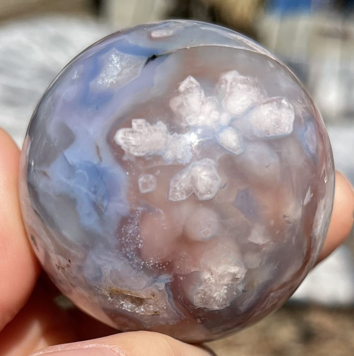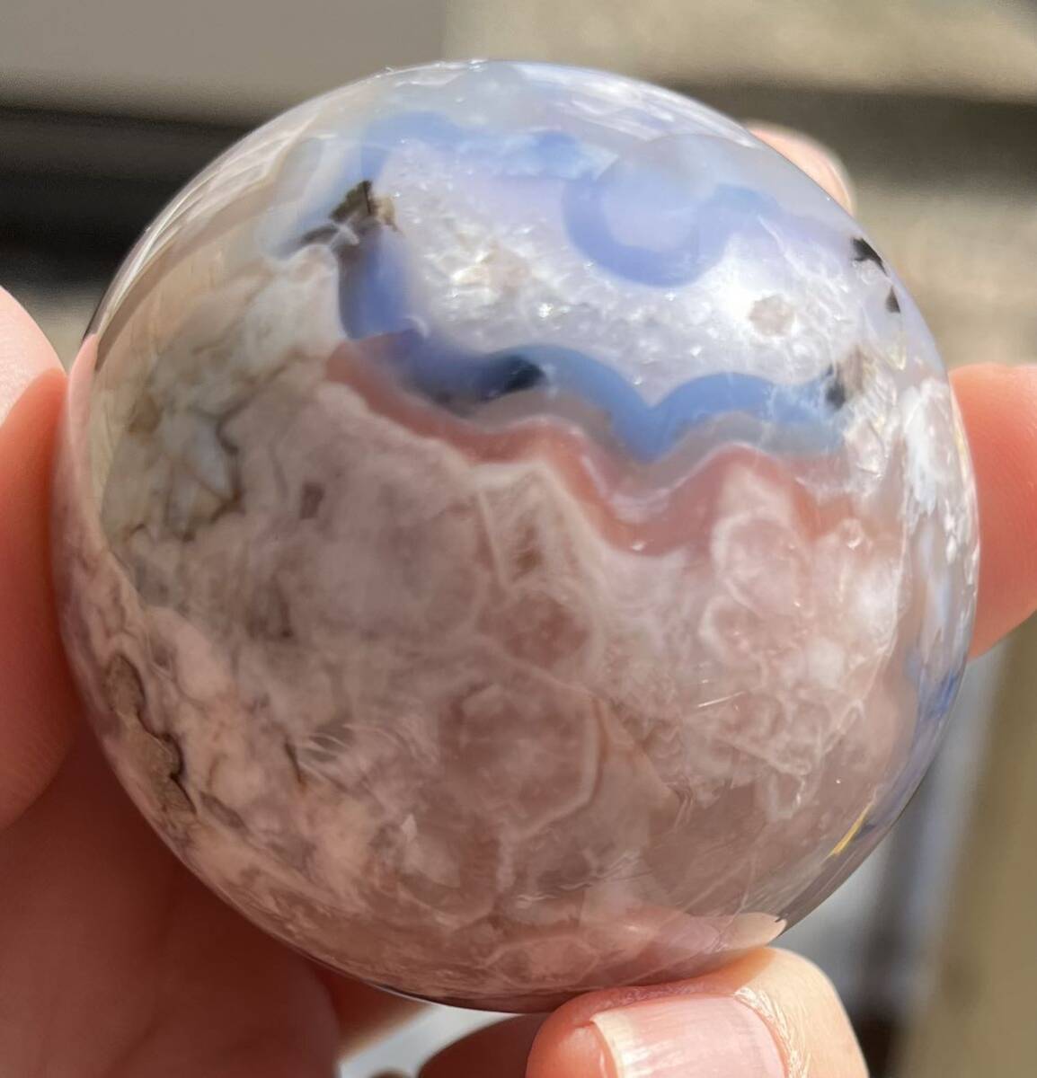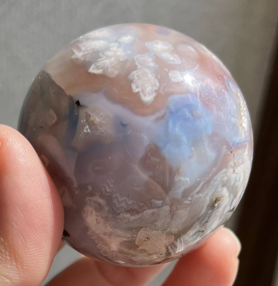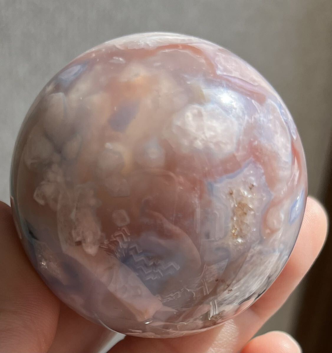 約51mm玉 重さ177.9g ご覧の様に美しいフラワーアゲ-トです。桜瑪瑙(さくらめのう)は、運気の流れを良くする意味と効果があります。 厳しい状況から抜け出す、チャンスを作るパワーストーンです。 「希望の光」を求める時、暗い過去から、明るい未来へ導くお守りです。 桜瑪瑙は、魔除けの意味と効果もあります。 周囲に漂う、邪悪なエネルギーを防ぐパワーストーンで持ち主へのダメージを、最小限に抑えてくれます。 穏やかな日々を望む時に効果を発揮してくれるでしょう。浄化してお届け致します。小さくドル-ジ-ホ-ルが数ヶ所有り光があたるとキラリとします。天然石ならではのナチュラルラック等ある場合がございます。人為的傷等ございません。尚他のカテゴリーにも同じ物を出品しています。ドル高騰に伴い仕入れ値も上がっています。それ以前に仕入れたもので更にかなりお値引きしています。日頃の感謝を込めてAutumn special ラストdiscount
