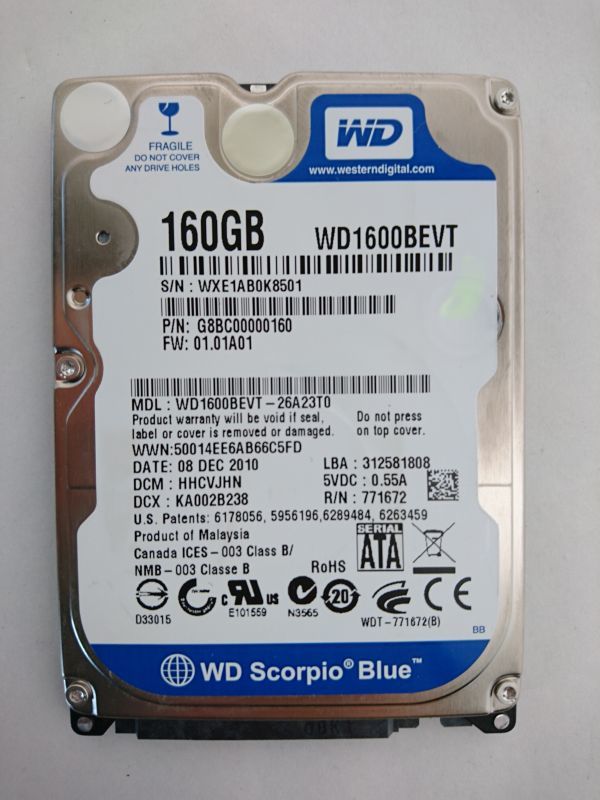 ・メーカー:WESTERN DIGITAL(ウエスタンデジタル) ・型番:WD1600BEVT ・容量:160GB ・回転数:5400 rpm ・キャッシュ:8MB ・インターフェイス: Serial ATA300 ■付属品:本体のみ