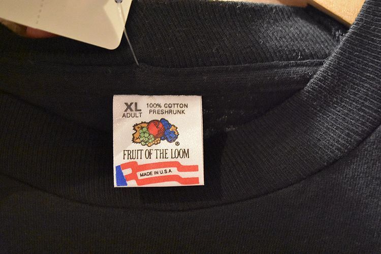 グッドプリントUSA製アメリカ製90SビンテージFRUIT OF THE LOOMフルーツオブザルーム長袖プリントTシャツロンT黒ブラックXL企業物n2427