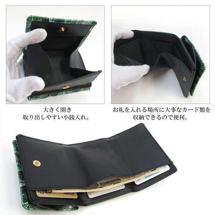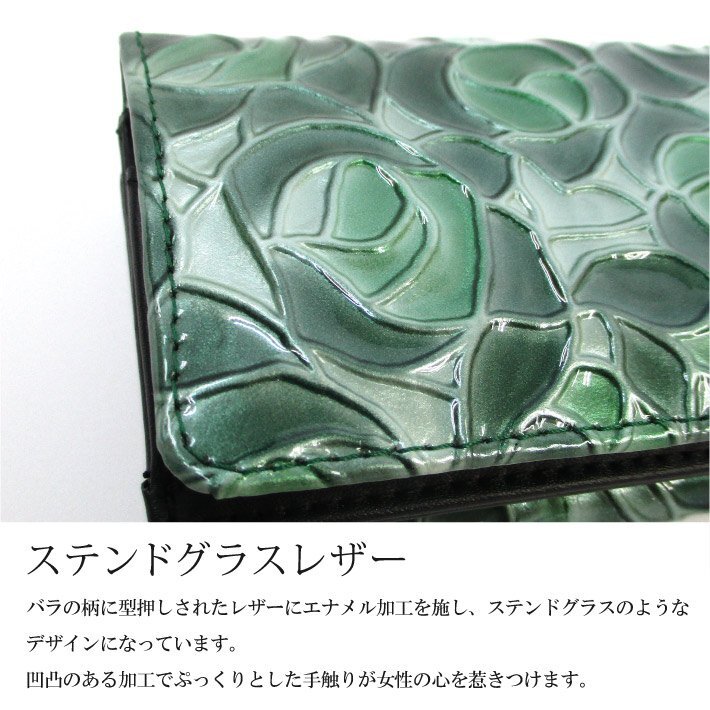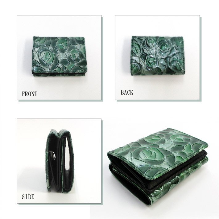 | バラの柄に型押しされたレザーにエナメル加工を施し、ステンドグラスのようなデザインになっています。 凹凸のある加工でぷっくりとした手触りが女性の心を惹きつけます。 コンパクトで使い勝手がいいサイズ感とデザインです。 誕生日プレゼント・クリスマス・バレンタイン・母の日などの贈り物にも最適です。 ■カラー:GR/BLACK(グリーン) ■素材:外側 牛革(花柄押しエナメル加工)、内側 牛革 ■サイズ(約):横9.7cm×縦7.5cm×マチ3.4cm ■重量:約80g ■仕様:お札入れ×1、お札入れ仕分けポケット×3、小銭入れ×1、フリーポケット×1 --革製品について-- ・製作過程により多少の傷、汚れ、縫い目が粗い、塗装にムラ、接着剤跡等がある場合がございます。 ・天然素材の商品は、自然由来の素材のため革には細かなシワや傷跡・トラ等が存在する場合があります。 ※シワなどは、動物の生育環境や年齢、個体によって異なる、革の特性です。 ・ご覧のモニターやプラウザの設定、照明等により、画像と実物の色合いが、若干異なる場合がございます。 これらについては予めご理解頂いた上でご購入お願いします。 | |