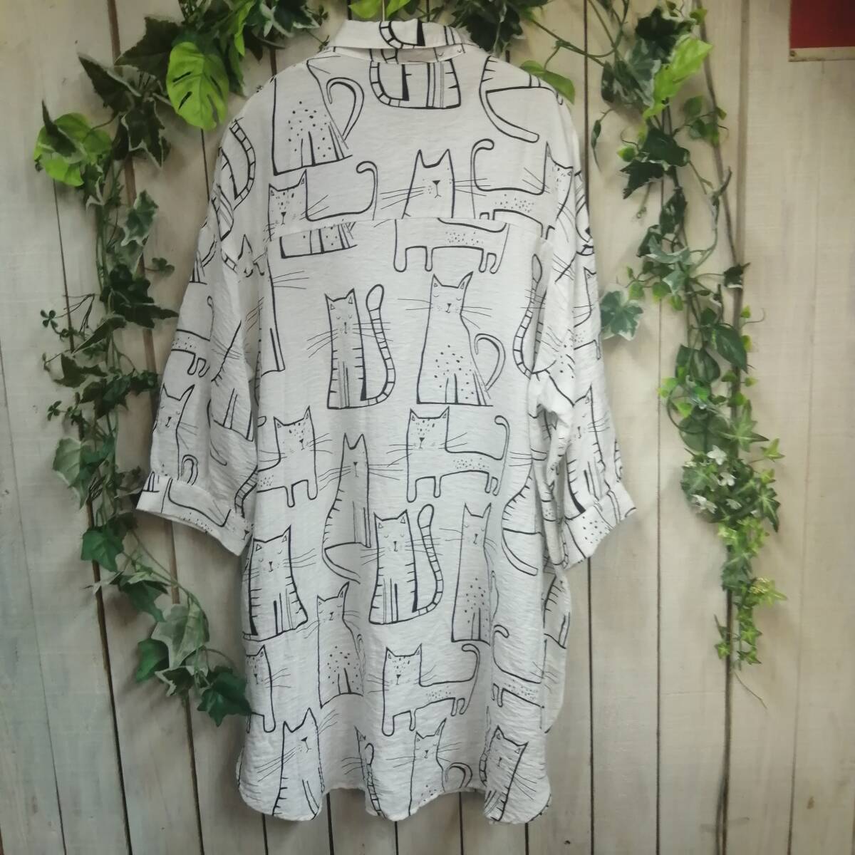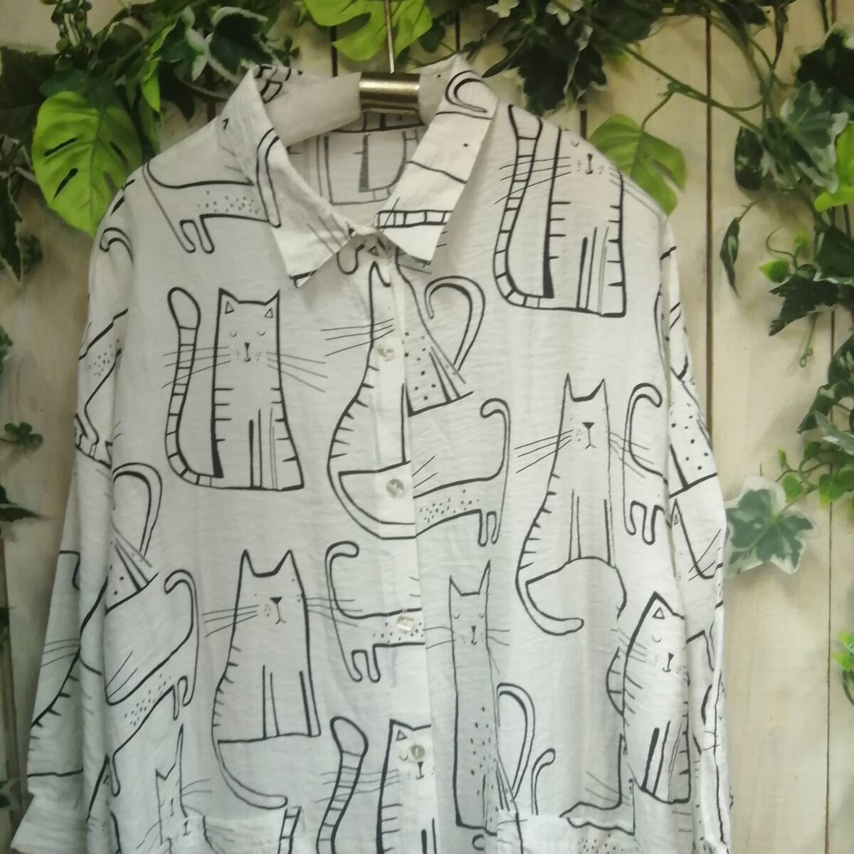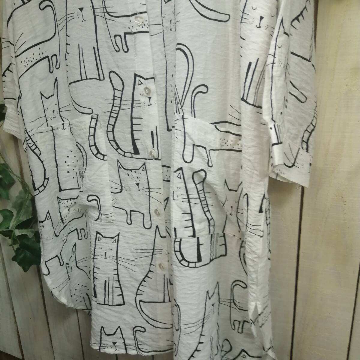 ★C310★noa-ge★ノアージュ★ねこ柄プリント★ロング★ブラウスシャツ★前開き★長袖★サイズL レーヨン77%